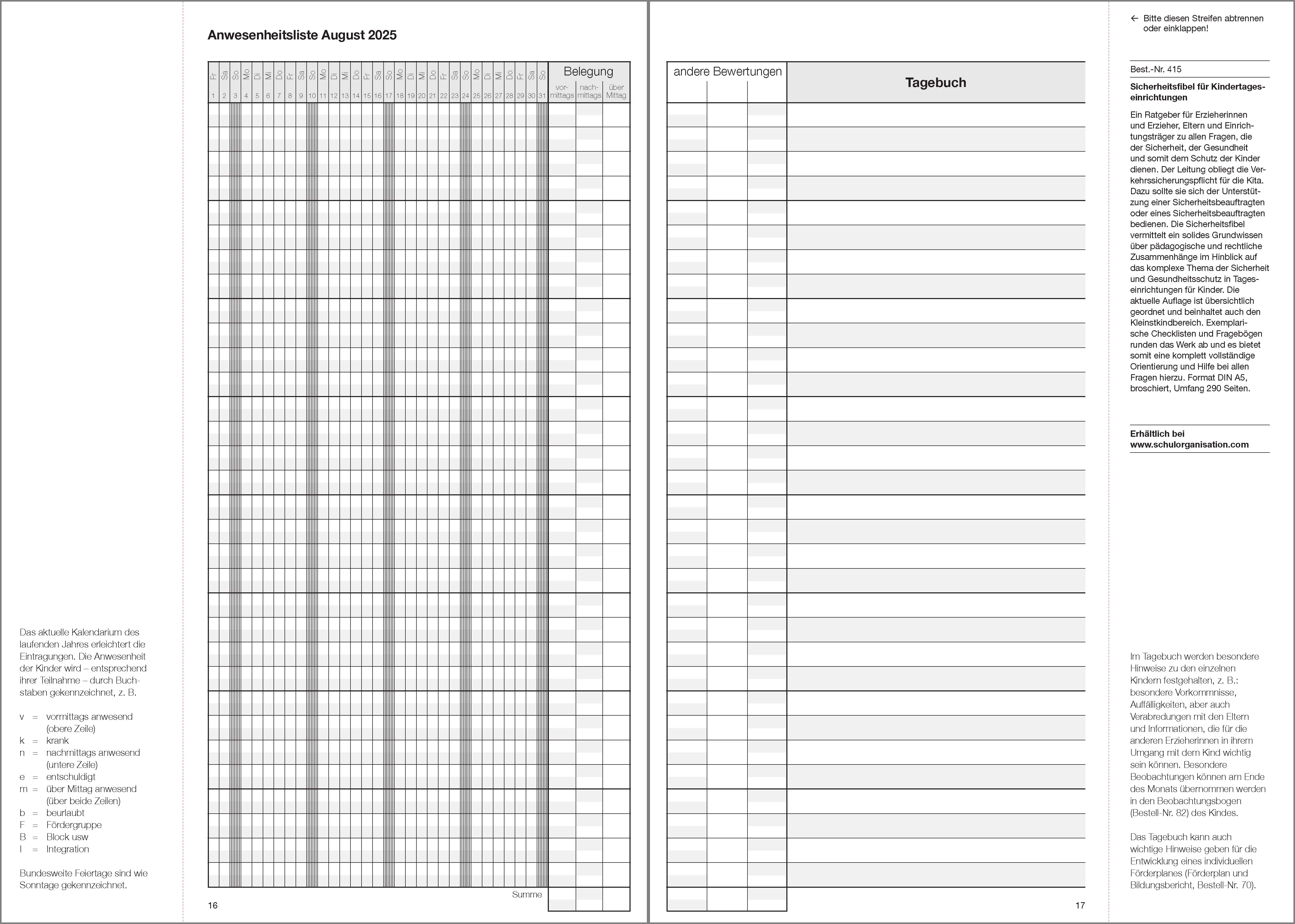 Anwesenheitsliste mit Kalendarium für das jeweilige Kita-Jahr für Kindergärten, Tagesstätten, Horte und andere Einrichtungen für Kinder; mit Raum für Personalien und weitere Angaben für 32 Kinder, mit Belegungsplan vormittags, über Mittag, nachmittags und anderen Kriterien.