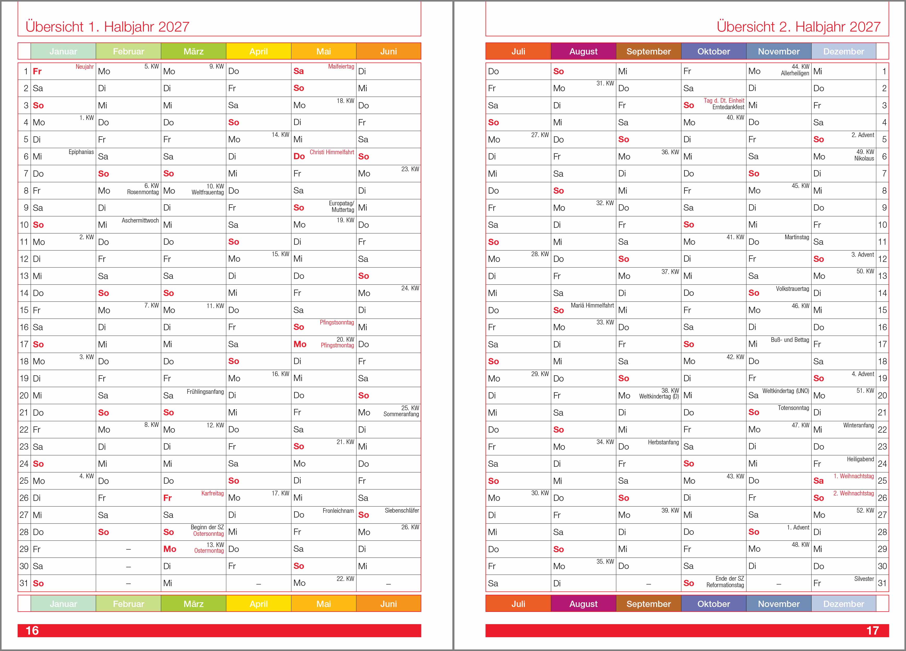 Mit jährlich wechselndem Titelmotiv, Wire-O-Bindung (ähnlich Spiralbindung).