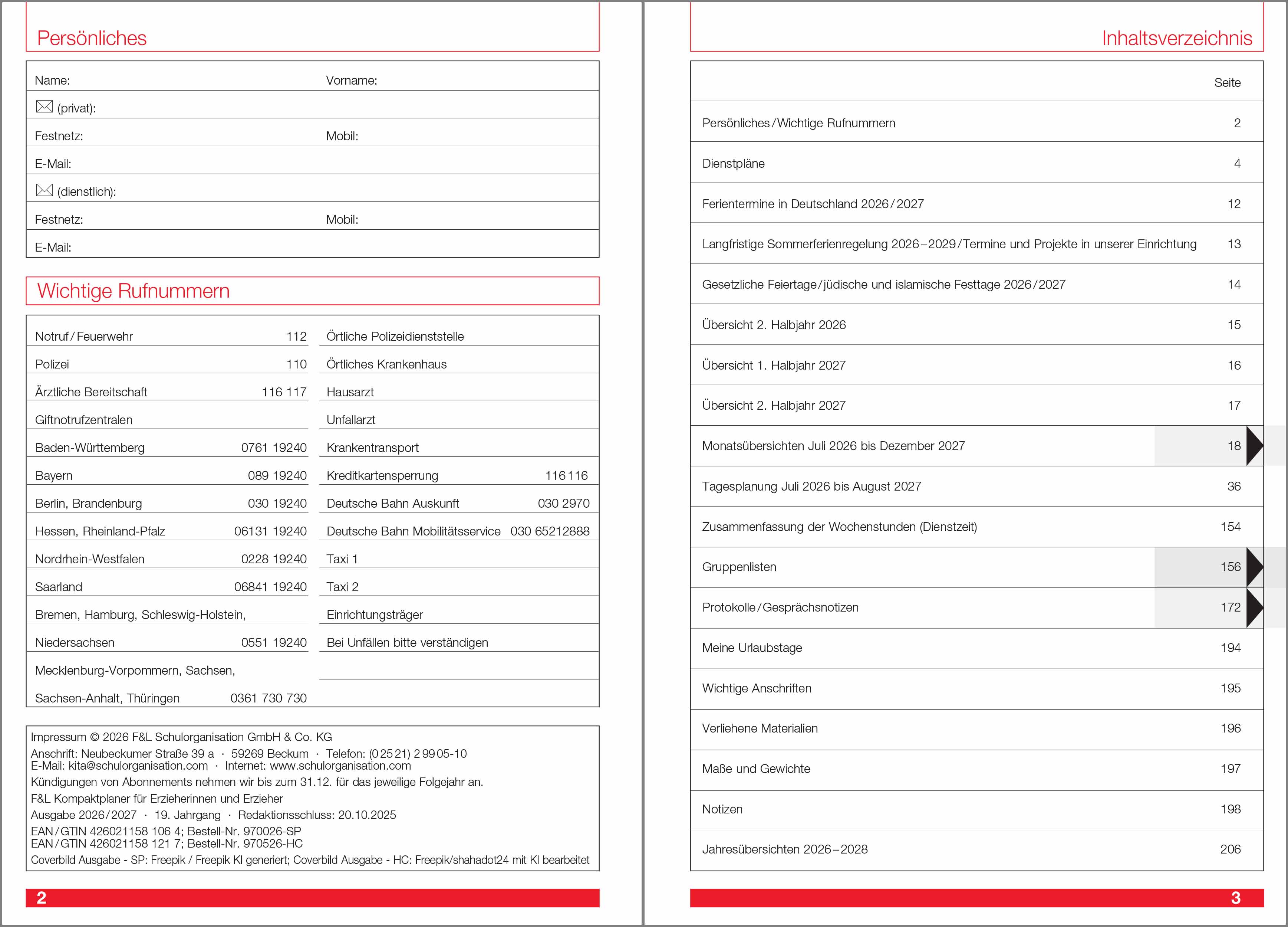 Kompaktplaner für Erzieherinnen und Erzieher als praktischer Begleiter in und außerhalb der Einrichtung. Mit dezent farbigem Innenteil, der die Orientierung im Kalendarium wohltuend unterstützt. Im handlichen Format DIN A5.