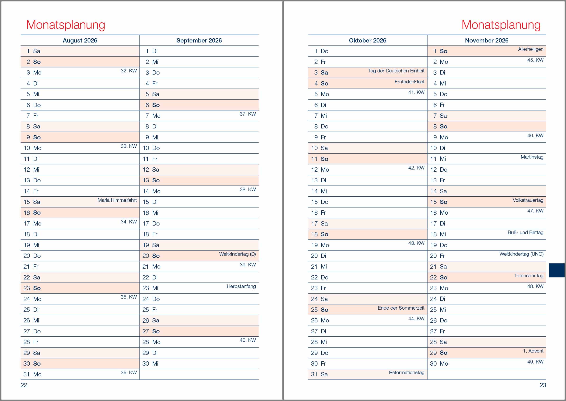 Schulwochen ab Juli bis August im Folgejahr, die Tage der Woche sind auf einer Einzelseite zusammengefasst,