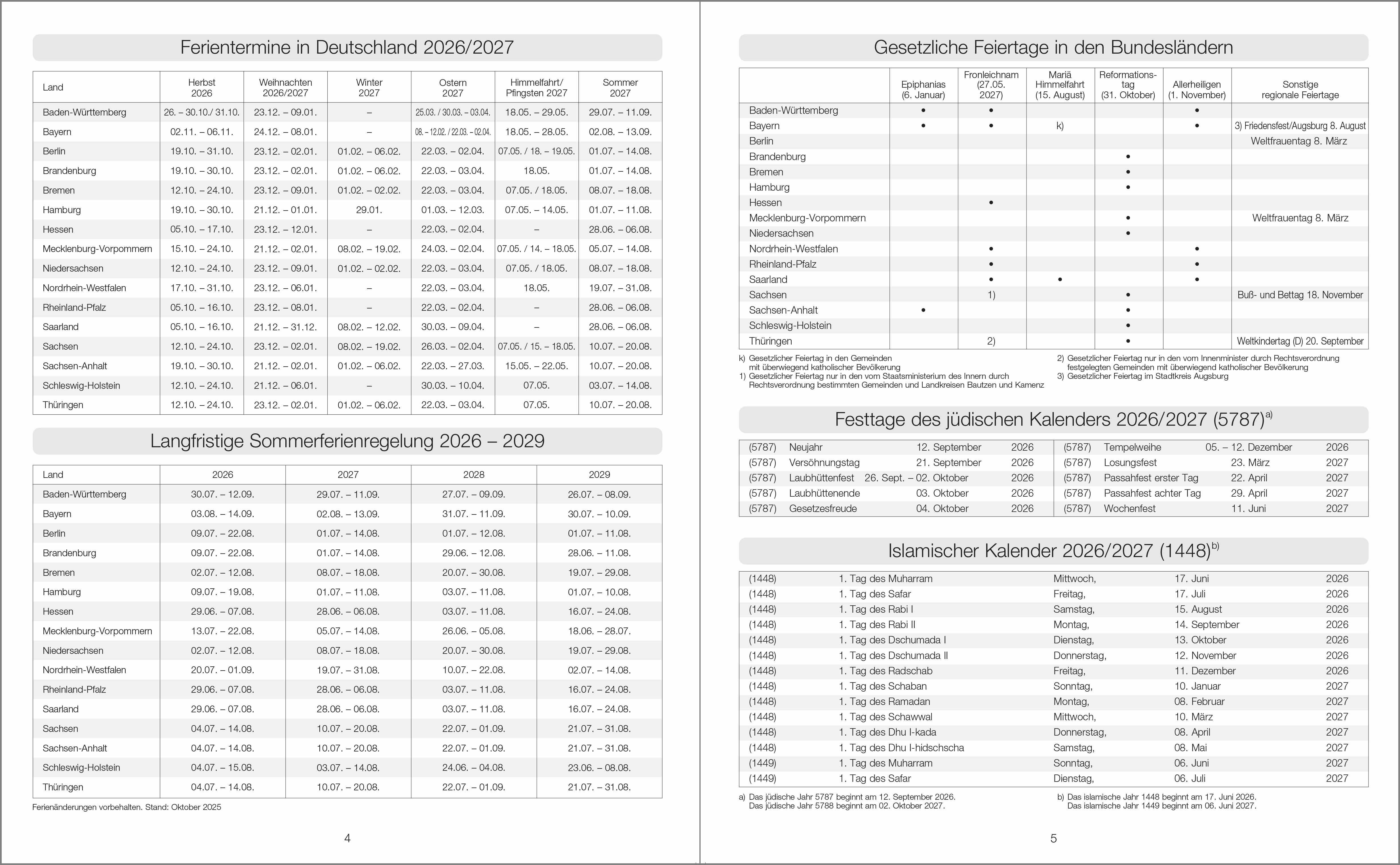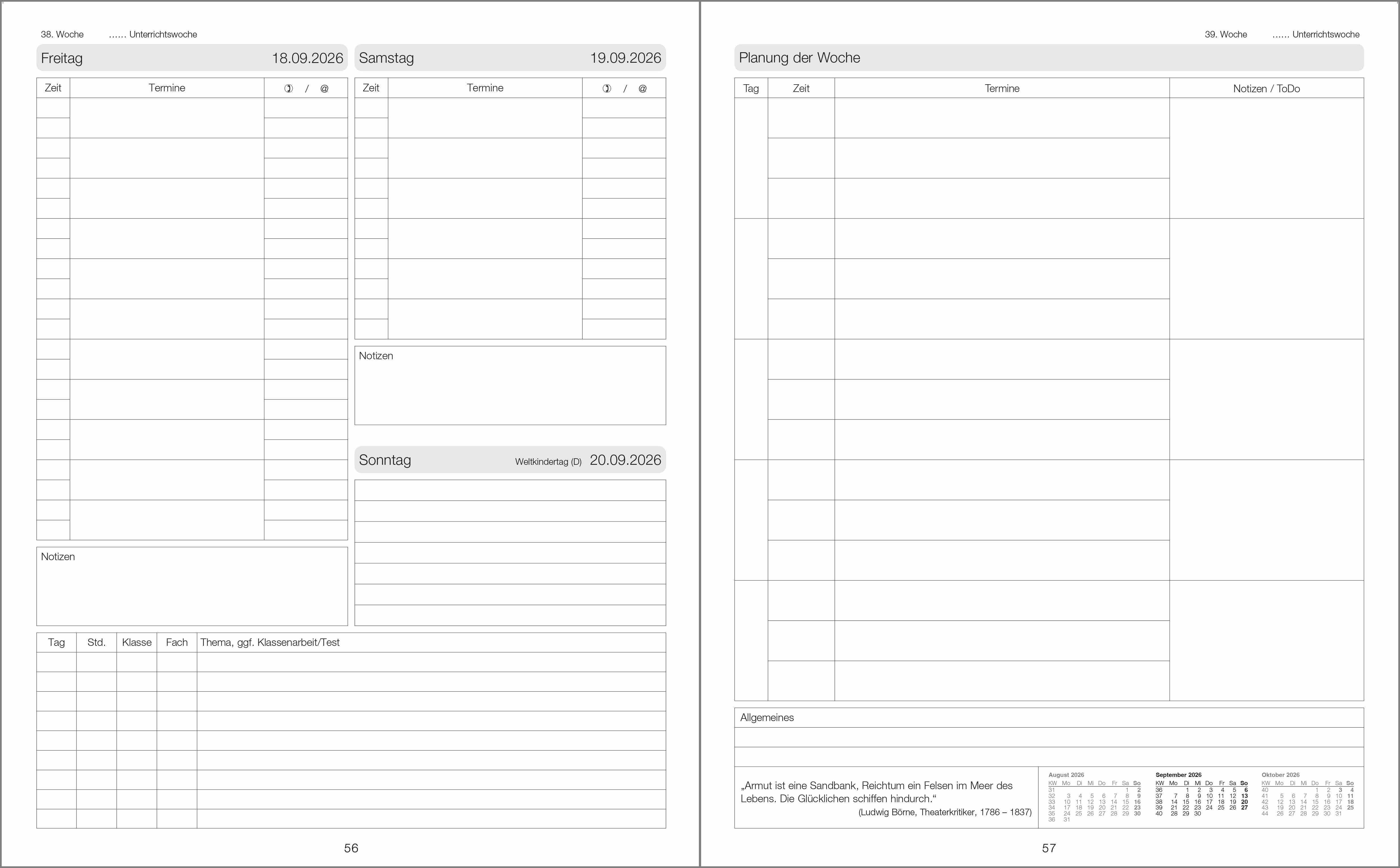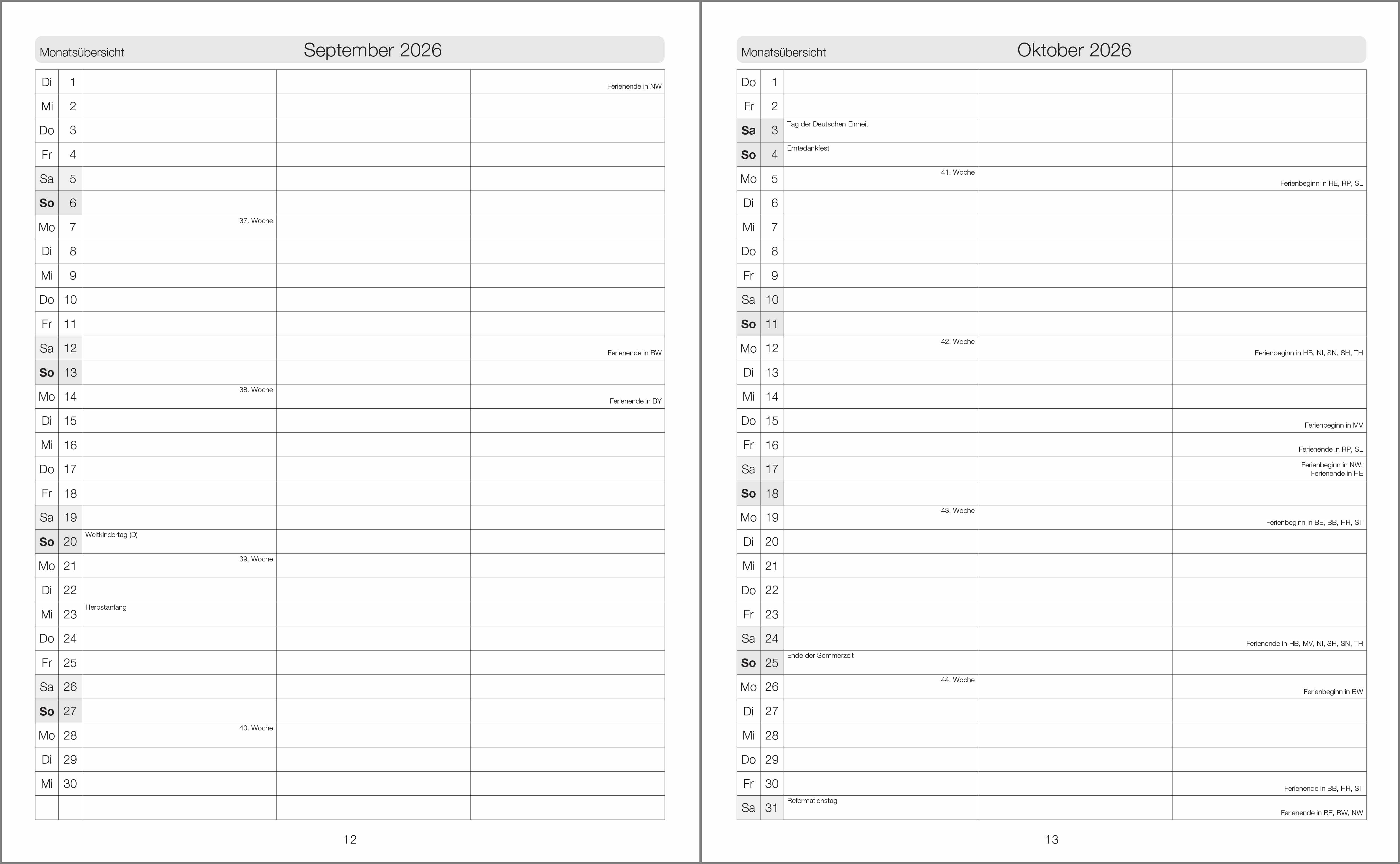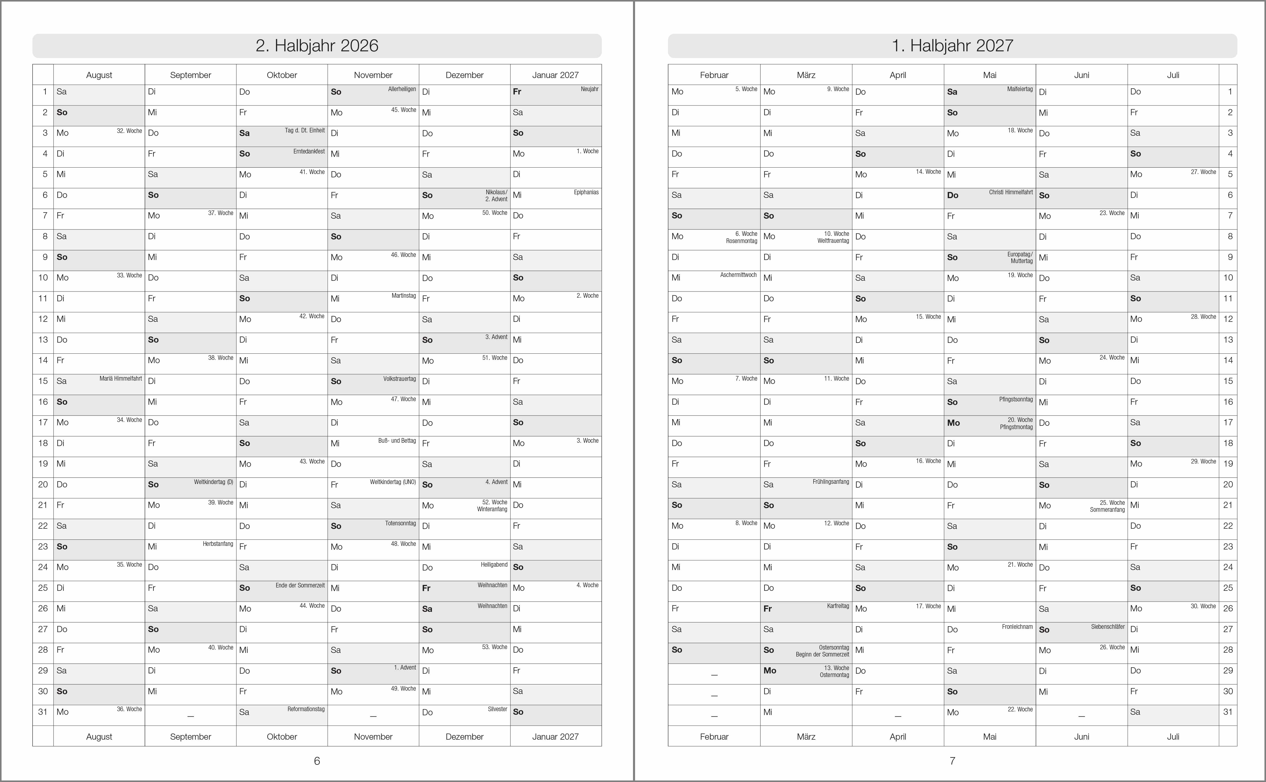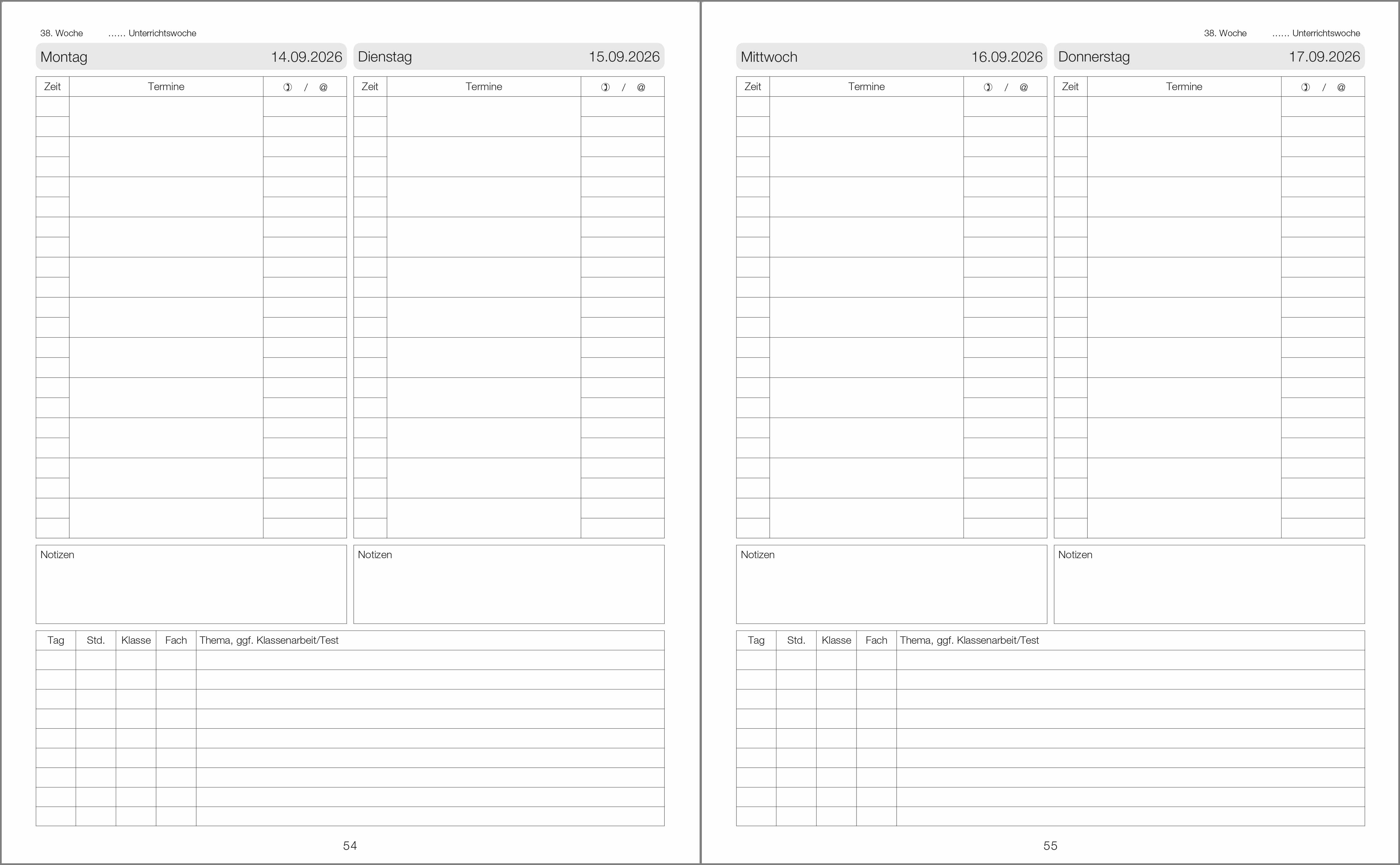Ideal für Schulaufsicht, Schulleitung und Lehrkräfte mit erweiterten Aufgaben. Mit zwei Tagen je Seite ist das Platzangebot angemessen großzügig. Echt bewährt.