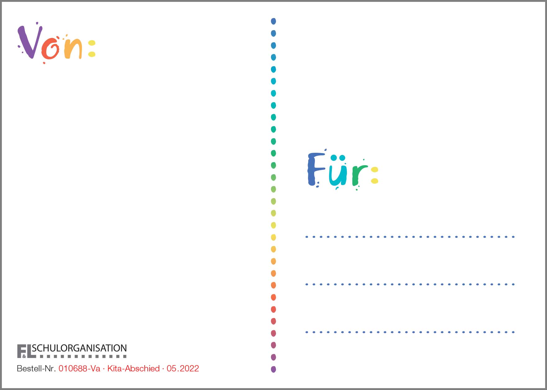 Diese liebevoll gezeichnete Postkarte mit den Motiven Tschüss oder Au revoir (jew. 50 Karten) kann zum Abschied der Kinder aus der Einrichtung einzeln ausgegeben werden oder in Verbindung mit anderen Dingen zum Abschied. Die Karte ist zugleich eine lebendige Erinnerung für das Kind, die Eltern und Großeltern und Verwandte. Widmung möglich.