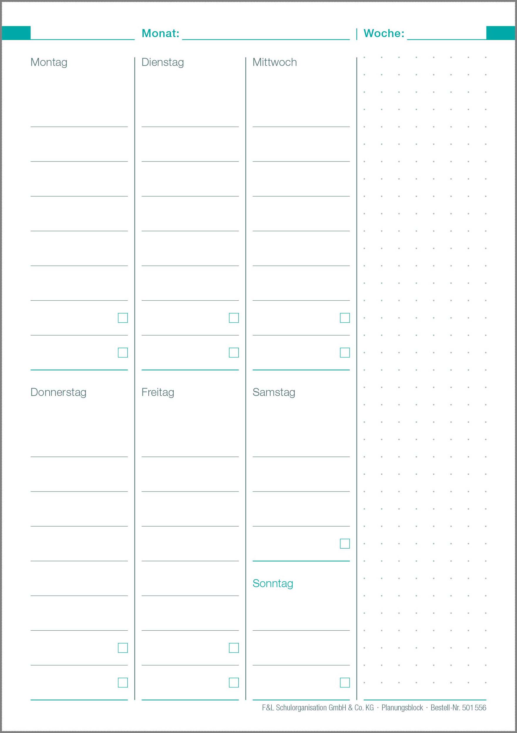 Dieser Block verschafft Ihnen maximalen Überblick über die ganze Woche. Universell für zu Hause, im Büro, in der Einrichtung oder als Einlage in andere Unterlagen oder nur am Kühlschrank. Der Planungsblock ist immer dabei.
