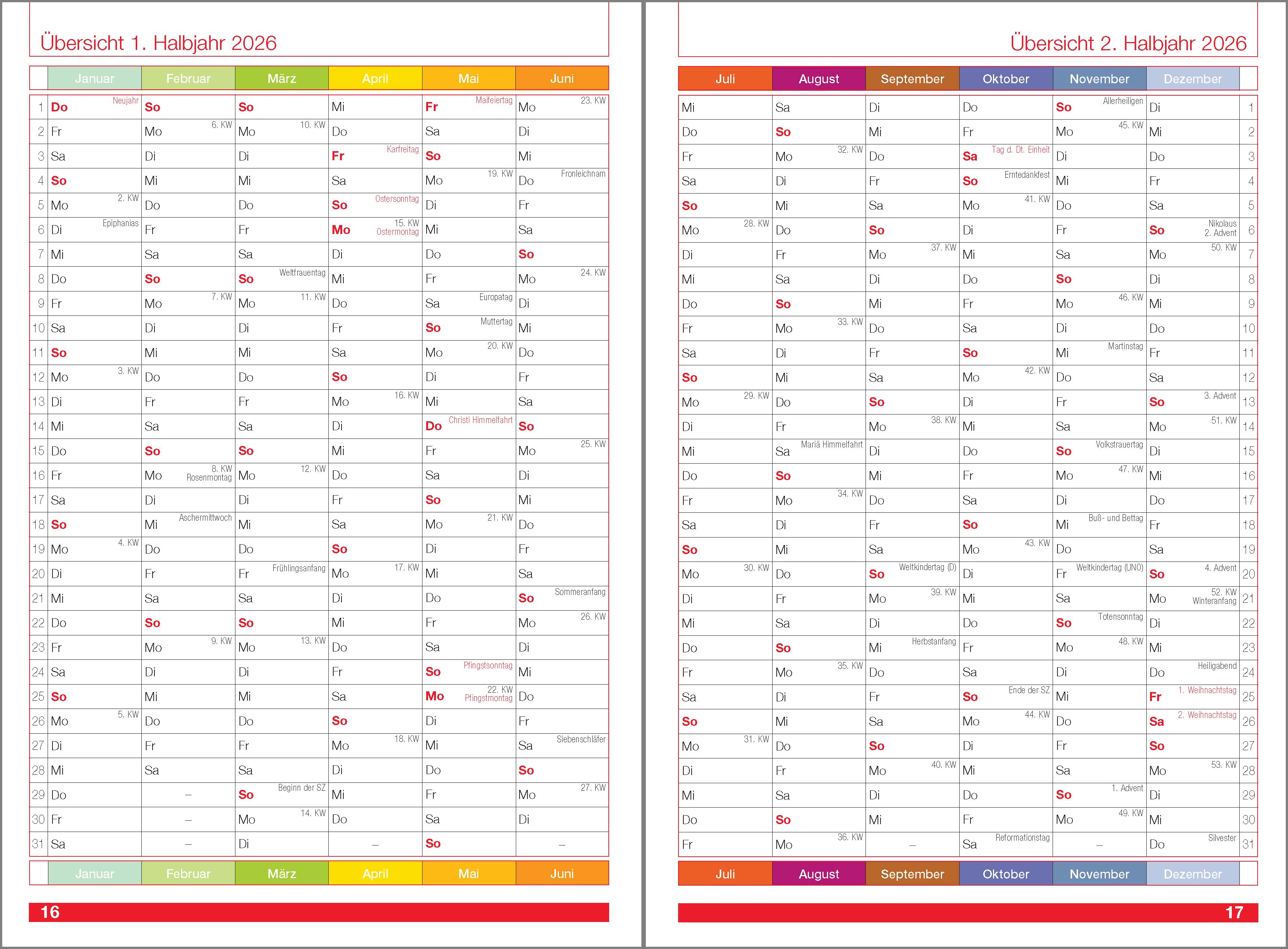 Ein Tischkalender ist prima, doch viel besser ist ein Tischkalender für das jeweilige Schuljahr. Auf dem Schreibtisch oder dem Küchentisch, neben dem Telefon, zu Hause oder im Dienst, egal wie, immer präsent. Der Kalenderwechsel findet im Sommerloch statt. Die Seitenabfolge im Einzelnen:Wichtige Rufnummern,Schulferien,Regionale Feiertage,Dienstplan,Stundenplan,Schuljahresübersicht,Projekte im Schuljahr,Monatsübersichten Juli bis Dezember im Folgejahr (18 Monate),Wochen ab Juli bis August im Folgejahr, die Woche hat auf 2 Seiten reichlich Platz,Umrechnung von Noten in Punkte,Verliehenes,Seiten neutrale Notizen,Wichtige Anschriften,Postentgelte.Im Abonnement verfügbar. Das hat viele Vorteile für Sie: Sie erhalten die Ausgabe für das kommende Schuljahr frühzeitig [März/April)nach Hause geliefert und Sie sparen die Versandkosten. Im Shop Service unter Abonnenten-Verwaltung liegt ein Bestellschein für Sie bereit.Anregungen zu diesem Kalender sind immer willkommen.