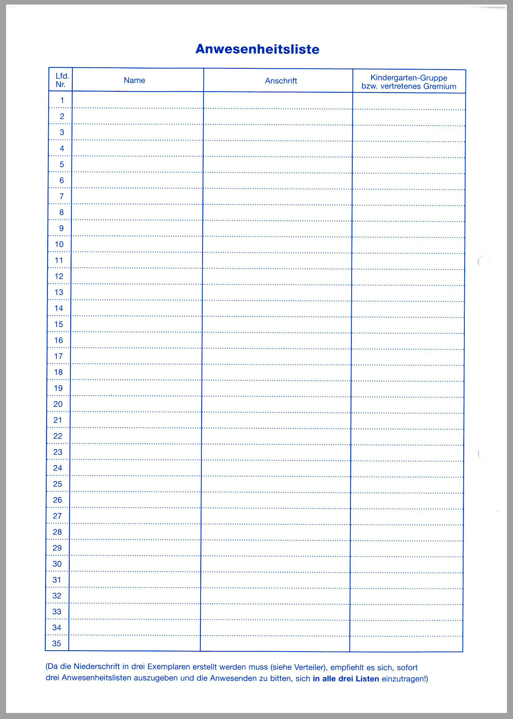Über die Sitzungen der Elternversammlung, des Elternrates und des Kindergartens sind Niederschriften mit Tagesordnungen anzufertigen,auch eine Anwesenheitsliste muss erstellt werden.