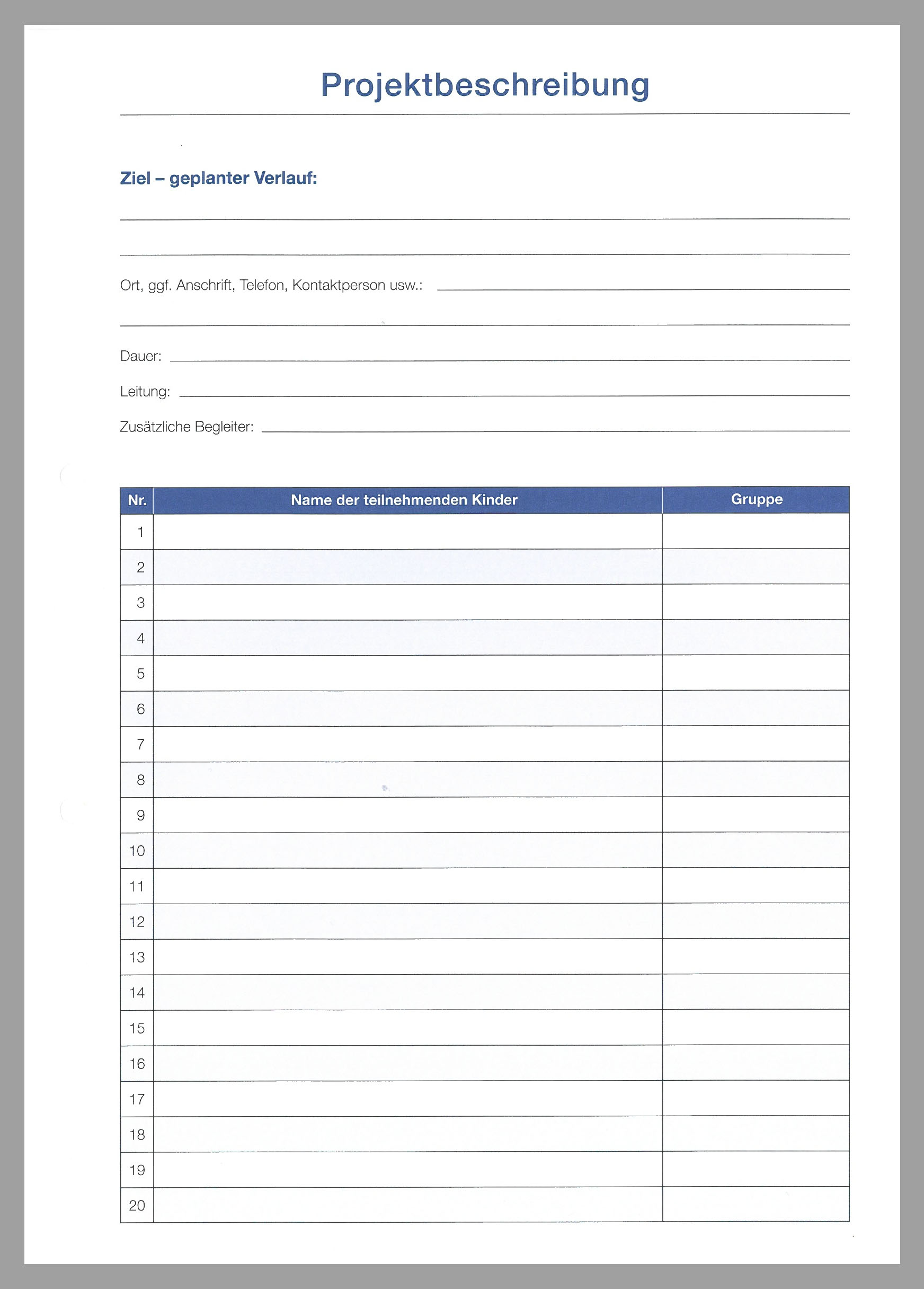 Das Blatt "Projektbeschreibung" wird zusammen mit den Anwesenheitslisten der Kinder in einem Schnellhefter zu einer Projektmappe zusammen gestellt. So sind alle Unterlagen und Daten während der Projektarbeit verfügbar.