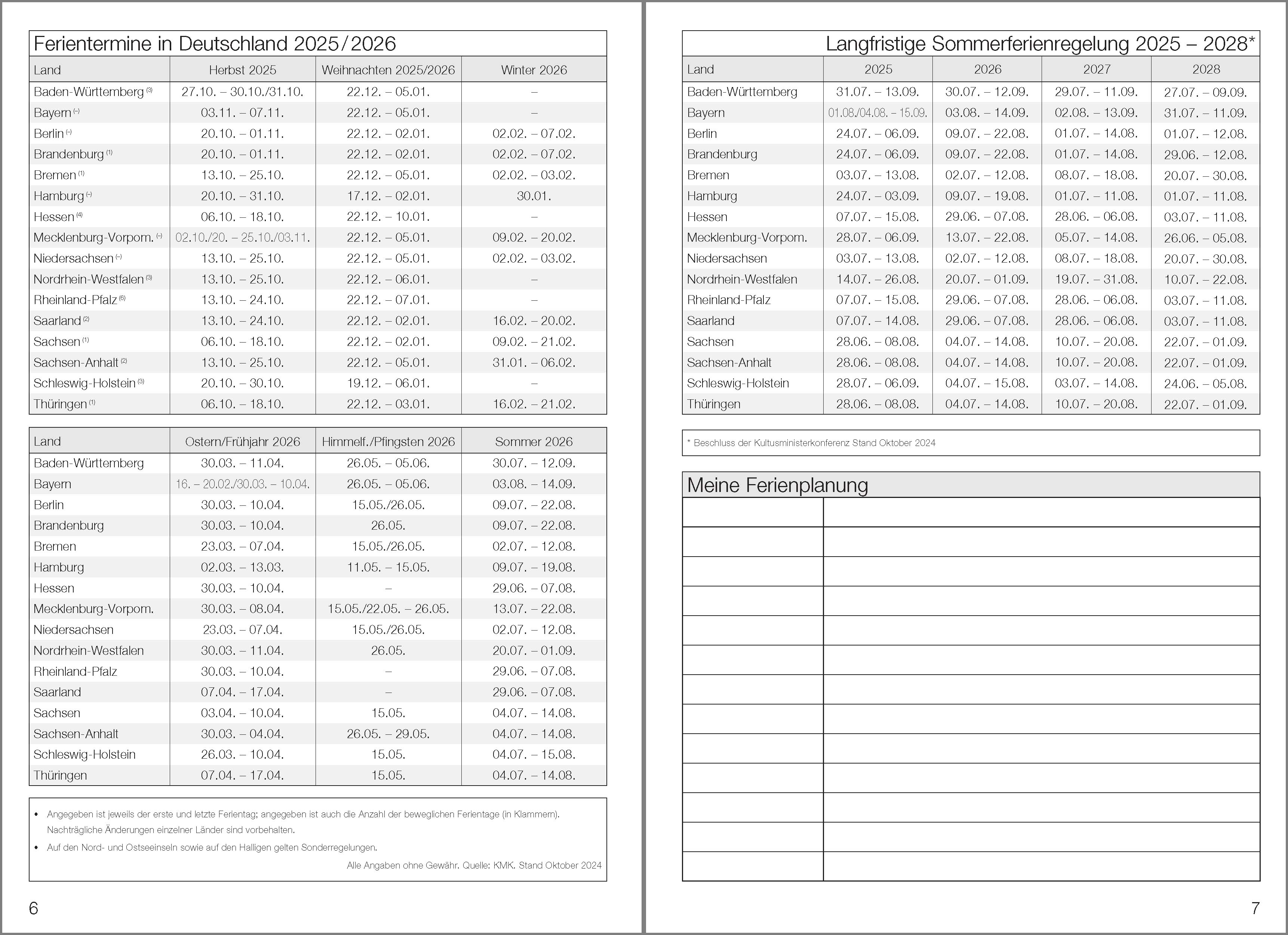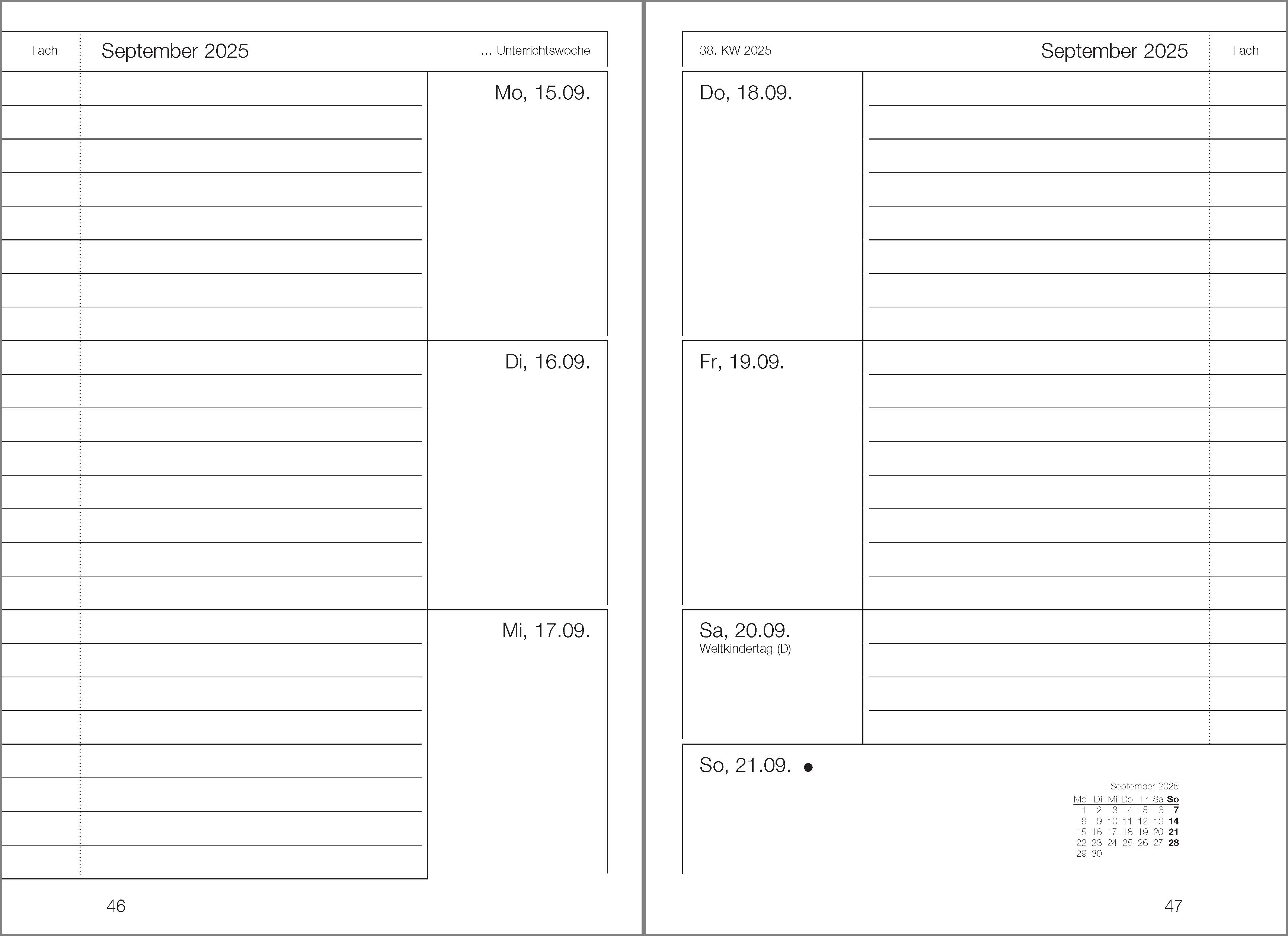 Ein Tischkalender ist prima, doch viel besser ist ein Tischkalender für das jeweilige Schuljahr. Auf dem Schreibtisch oder dem Küchentisch, neben dem Telefon, zu Hause oder im Dienst, egal wie, immer präsent. Der Kalenderwechsel findet im Sommerloch statt. Die Seitenabfolge im Einzelnen:Wichtige Rufnummern,Schulferien,Regionale Feiertage,Dienstplan,Stundenplan,Schuljahresübersicht,Projekte im Schuljahr,Monatsübersichten Juli bis Dezember im Folgejahr (18 Monate),Wochen ab Juli bis August im Folgejahr, die Woche hat auf 2 Seiten reichlich Platz,Umrechnung von Noten in Punkte,Verliehenes,Seiten neutrale Notizen,Wichtige Anschriften,Postentgelte.Im Abonnement verfügbar. Das hat viele Vorteile für Sie: Sie erhalten die Ausgabe für das kommende Schuljahr frühzeitig [März/April)nach Hause geliefert und Sie sparen die Versandkosten. Im Shop Service unter Abonnenten-Verwaltung liegt ein Bestellschein für Sie bereit.Anregungen zu diesem Kalender sind immer willkommen.
