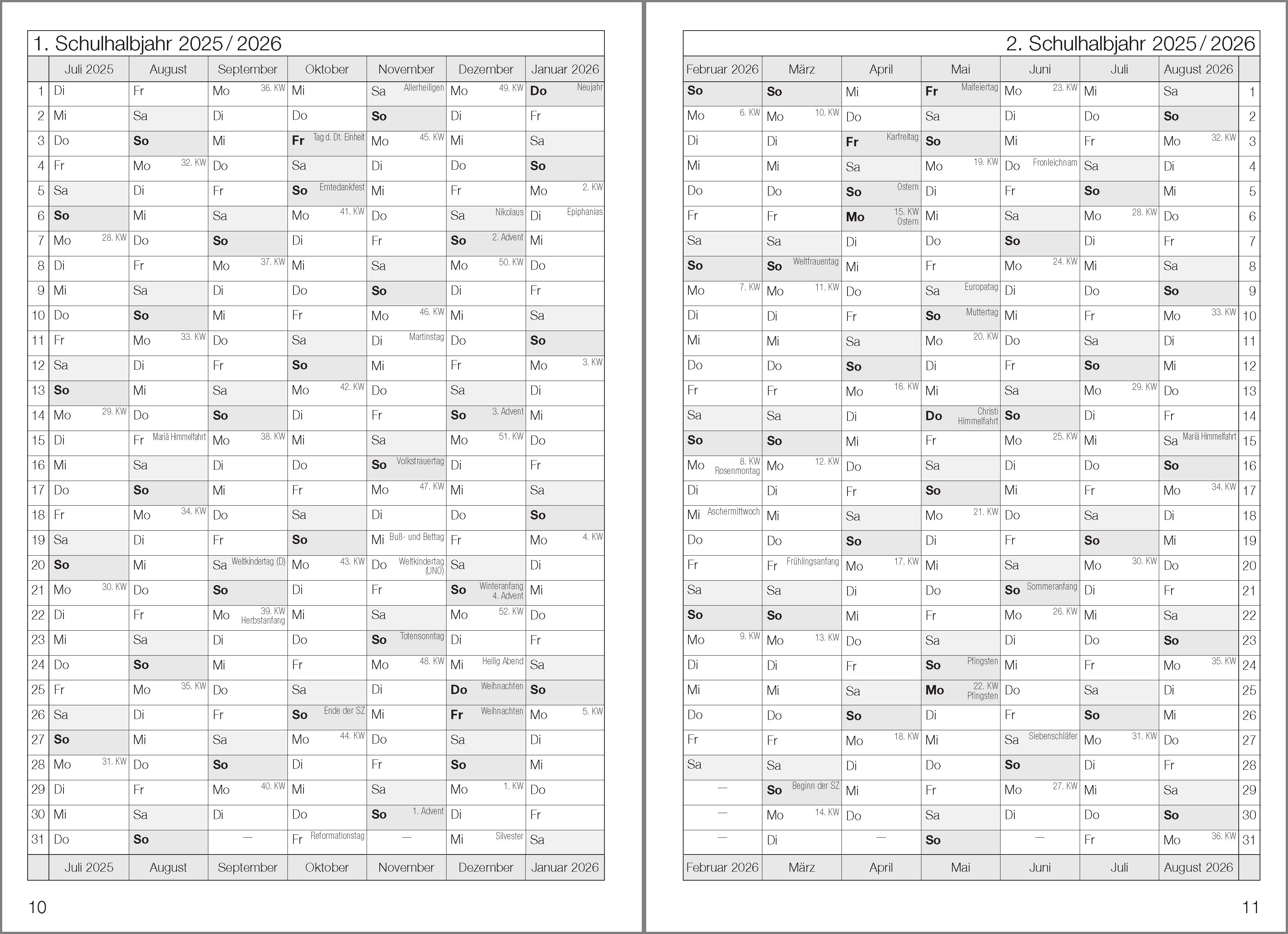 Schulwochen ab Juli bis August im Folgejahr, die Tage der Woche sind in horizontalen Feldern abgebildet,