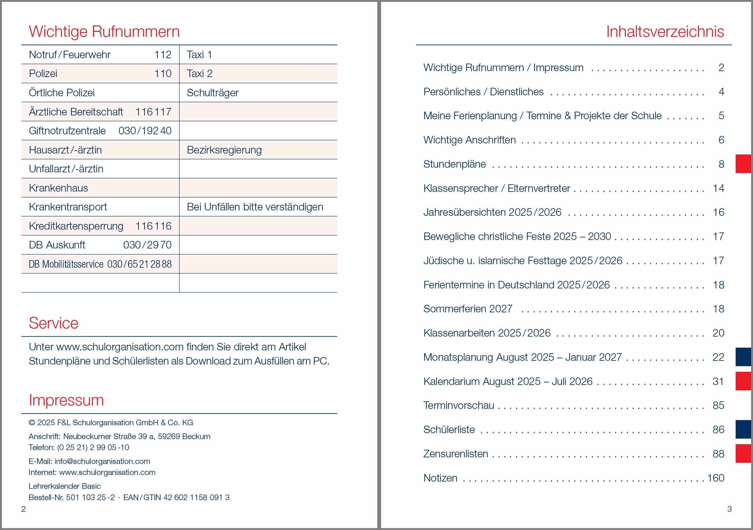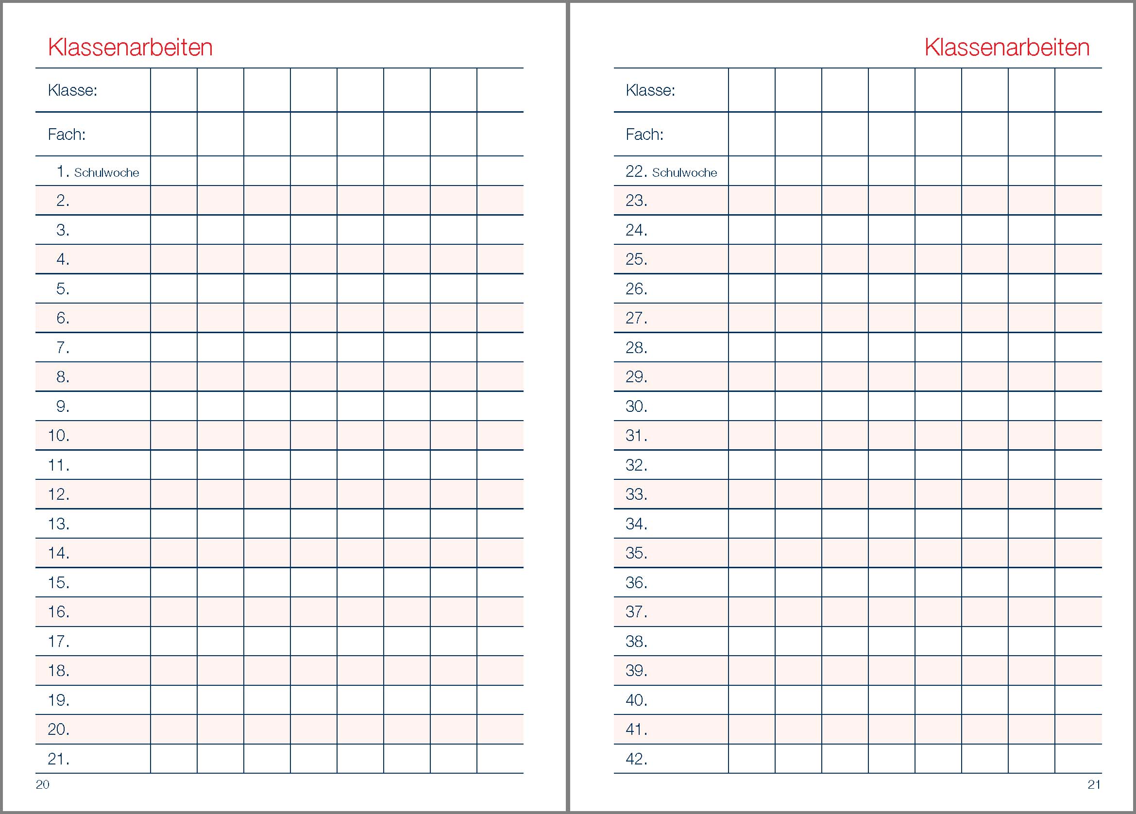 Minimalistischer Lehrerkalender für die wichtigsten Funktionen im Schulalltag als ständiger Begleiter, passt auch in die kleinste Jacken- oder Gesäßtasche. Eine Woche auf einer Seite, inkl. PVC-Schutzhülle, wahlweise in rot oder blau.Die Seitenabfolge im Einzelnen:Wichtige Rufnummern,Inhaltsverzeichnis,Persönliche Daten,Wichtige Anschriften,Stundenpläne,Klassenämter,Jahresübersichten,Ferientermine in Deutschland,Langfristige Sommerferienregelung,Feiertage und Festtage,Meine Ferienplanung,Klassenarbeiten im Schuljahr,Monatsübersichten Juli bis Dezember im Folgejahr (18 Monate),Schulwochen ab Juli bis August im Folgejahr, die Tage der Woche sind auf einer Einzelseite zusammengefasst, Folgezeit als Monatsübersichten,Klassenarbeiten im Schuljahr,Schülerlisten,Zensurenlisten (74 Seiten).Im Abonnement verfügbar. Das hat viele Vorteile für Sie: Sie erhalten die Ausgabe für das kommende Schuljahr frühzeitig [März/April) nach Hause geliefert und Sie sparen die Versandkosten. Im Shop Service unter Abonnenten-Verwaltung liegt ein Bestellschein für Sie bereit.SET kein Verkauf an Wiederverkäufer!Anregungen zu diesem Lehrerkalender sind immer willkommen.
