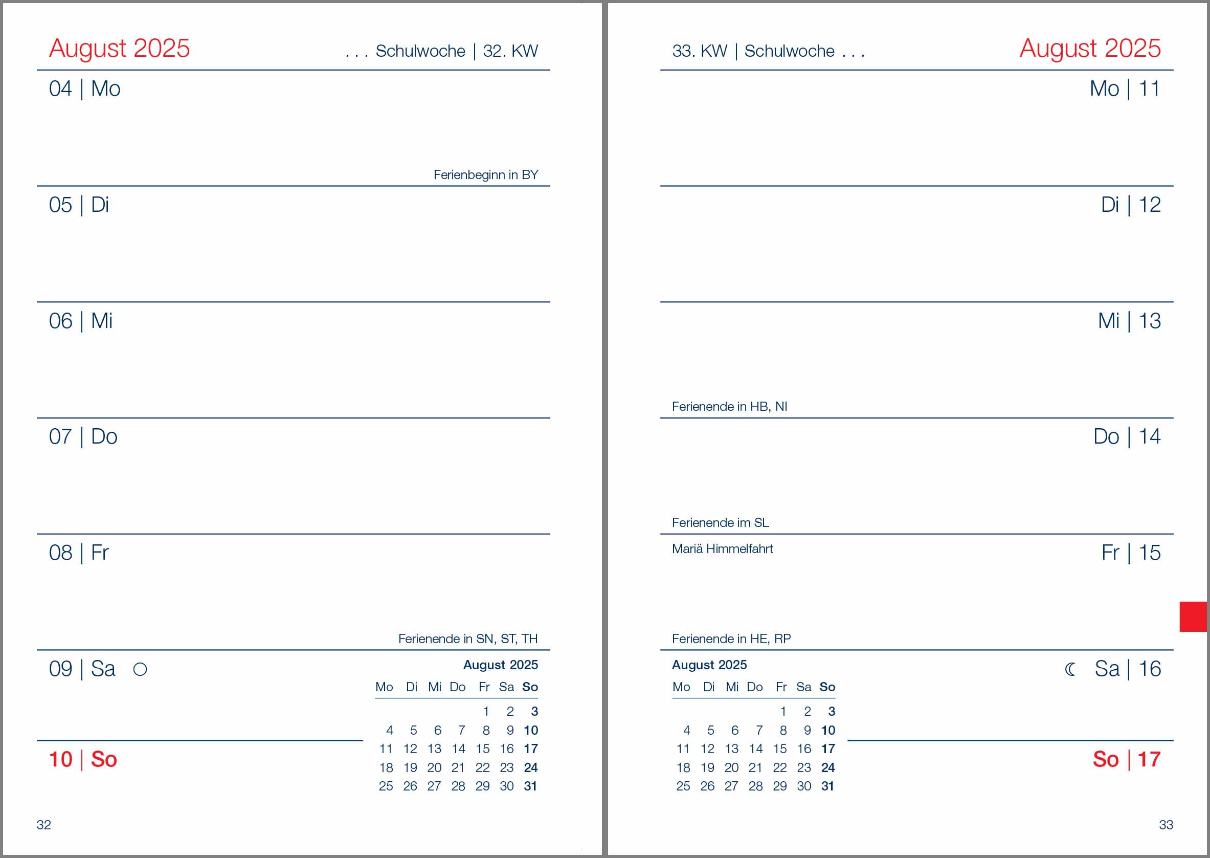 Schulwochen ab Juli bis August im Folgejahr, die Tage der Woche sind auf einer Einzelseite zusammengefasst,