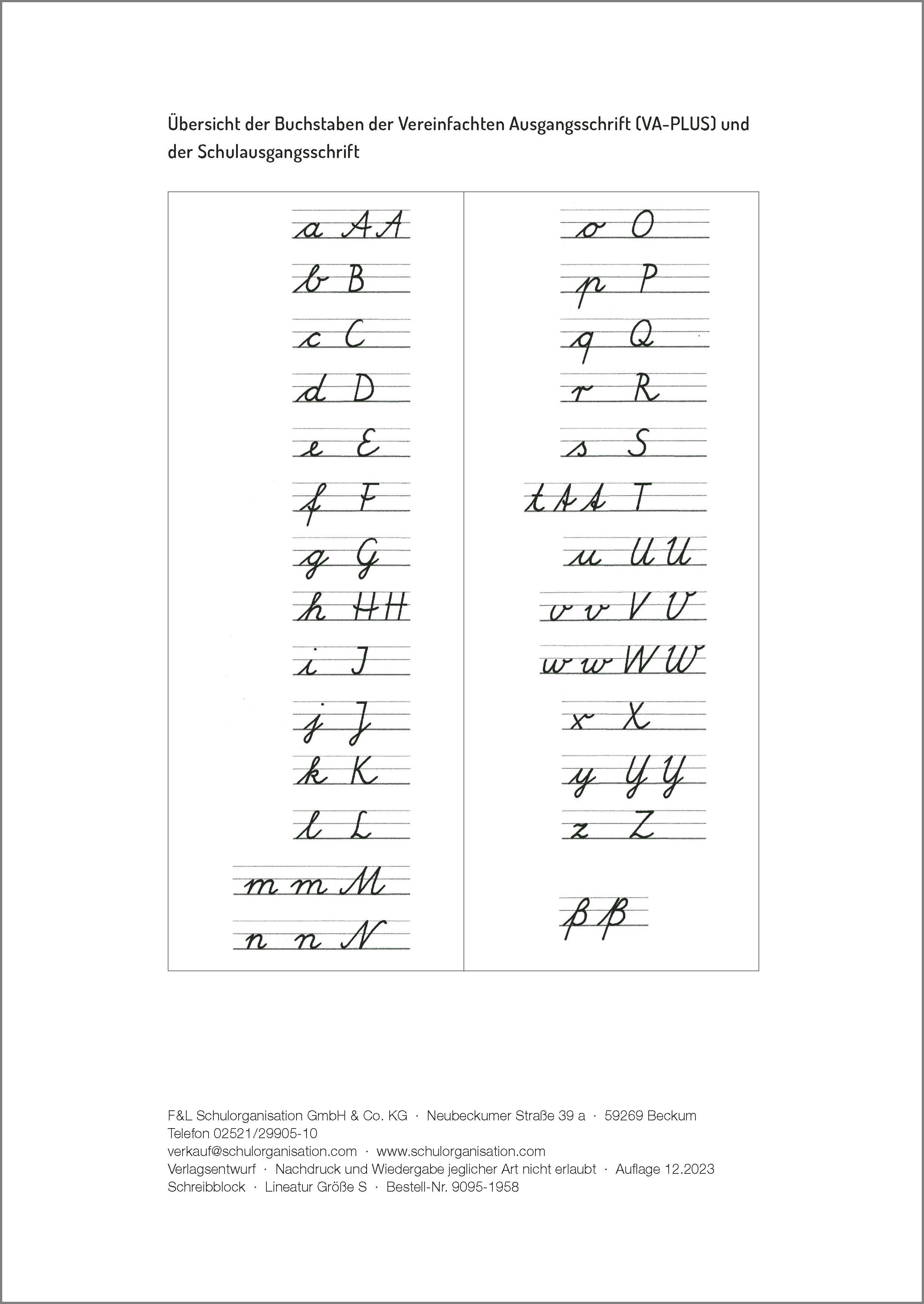 Dieser Block hat die Lineaturgröße S mit einer Übersicht der Buchstaben der Vereinfachten Ausgangsschrift und Hinweisen zu Schleifen- und Wellenbewegungen. Dieser Block kann auch in weiterführenden Schulen verwendet werden.