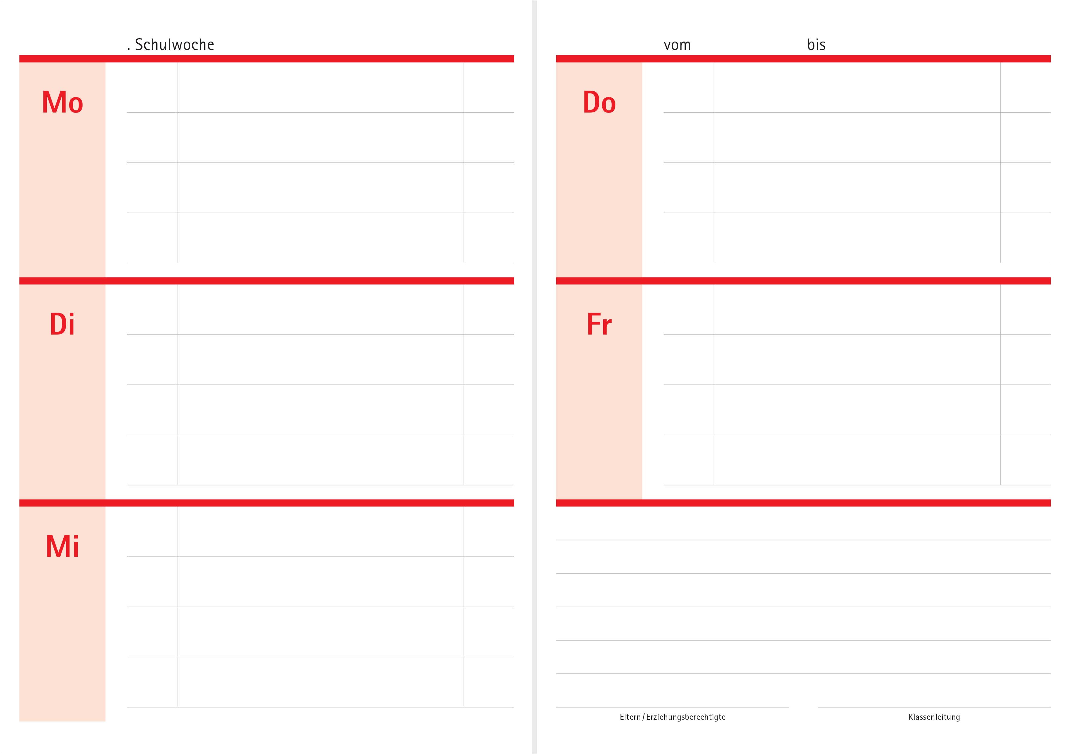abgesetzten Unterrichtswochen finden Sie auch hier, jedoch ohne die Symbole für die Wochentage und die Unterrichtsfächer. Jede Woche enthält zudem ein Feld für die Kommunikation zwischen Schule und Elternhaus.