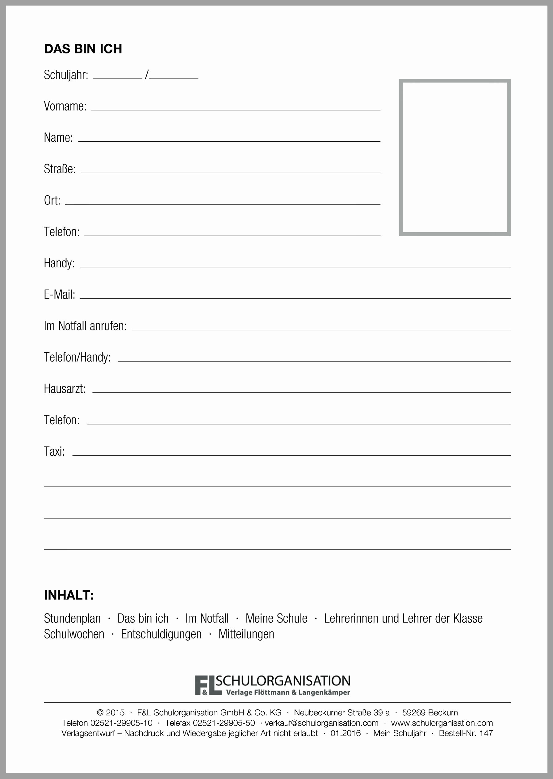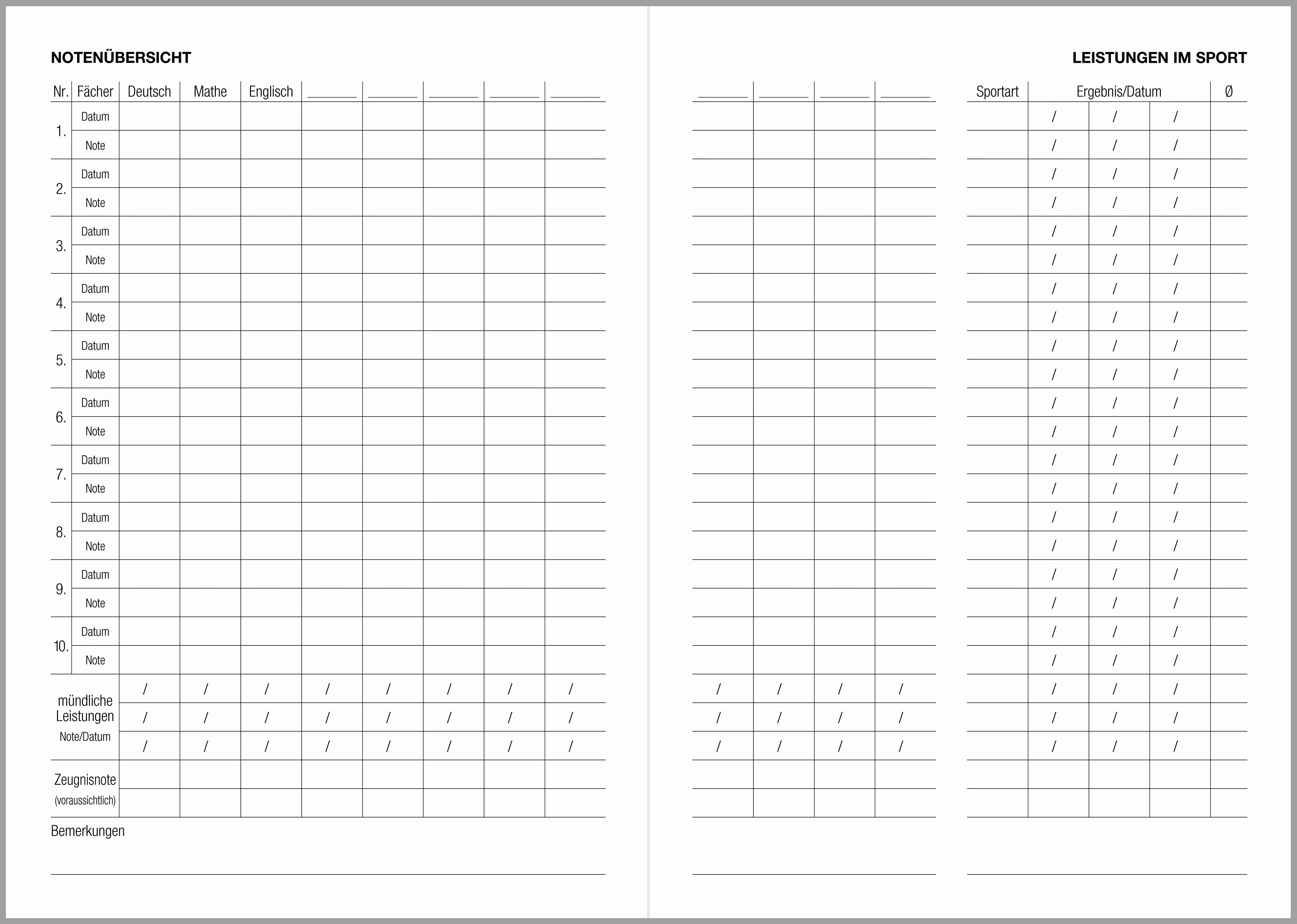 Mit Mitteilungsfeldern und wöchentlichen Unterschriftszeilen. Durch Seiten für den Stundenplan, Seiten