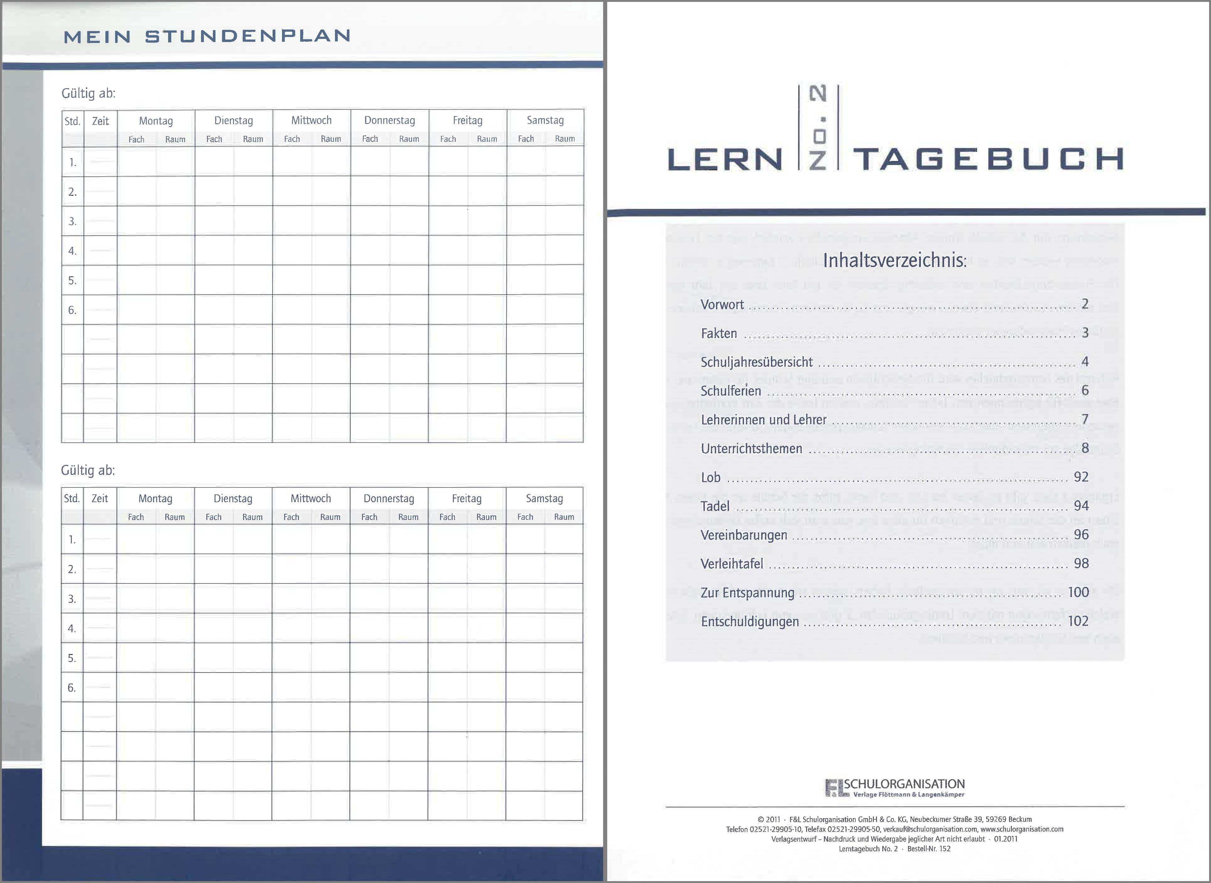 Lerntagebuch mit Stundenplänen, Schuljahresübersicht, Hinweisen zur Nutzung,