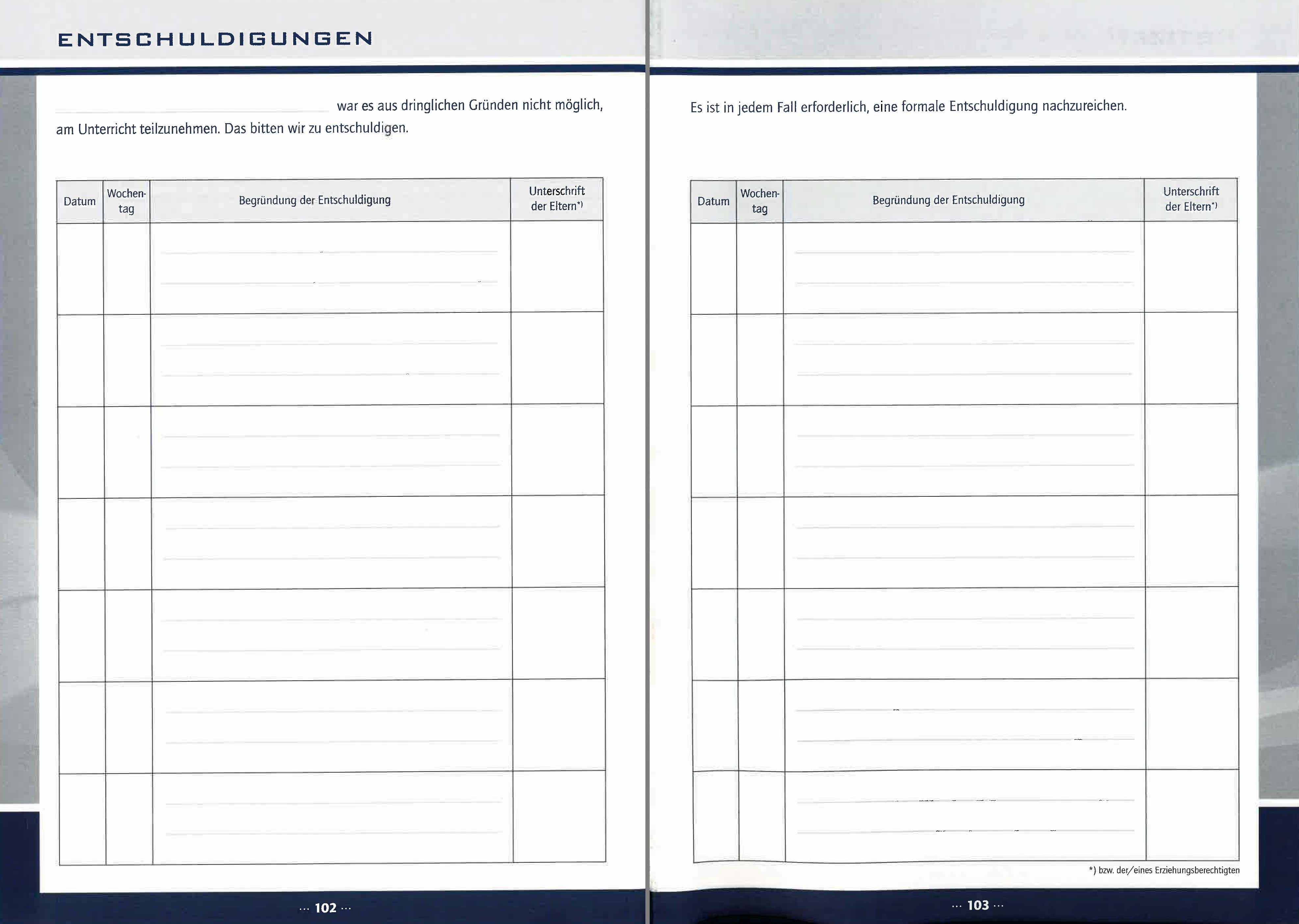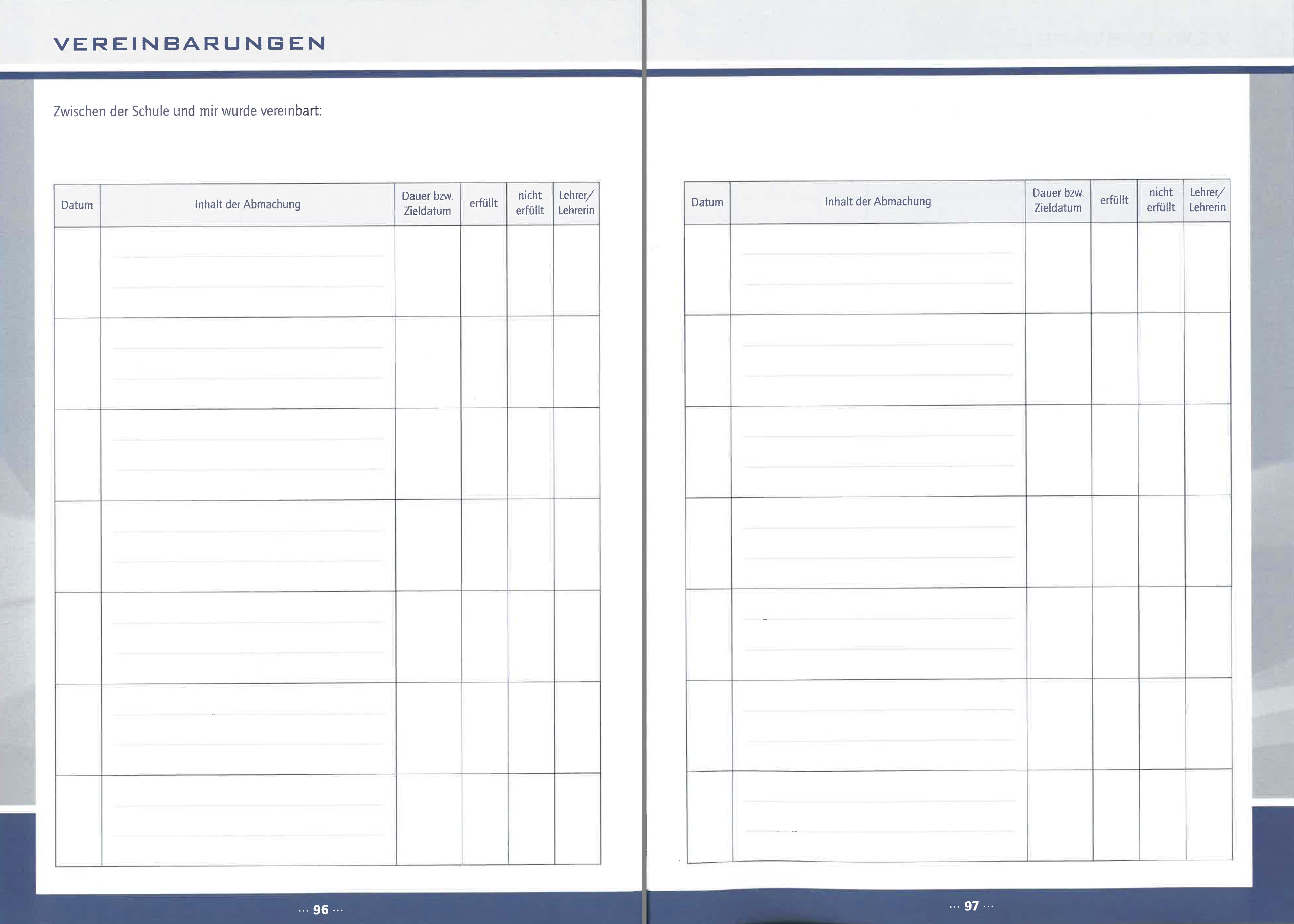 für Elternmitteilungen sowie Seiten für Lob und Tadel, Vereinbarungen und Entschuldigungen.