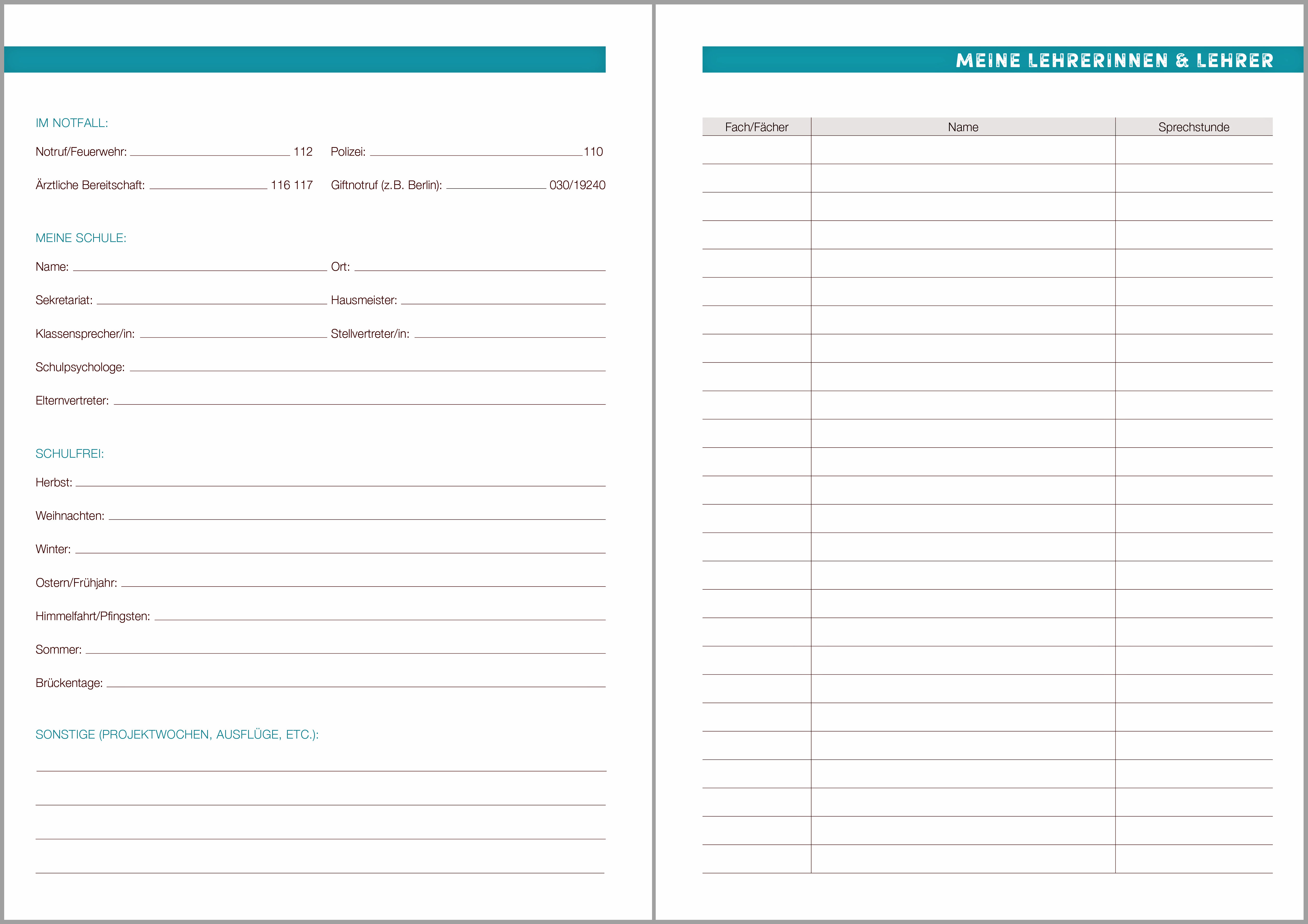 und Schule, mit Seiten für die Entschuldigungen bei Krankheit und anderen