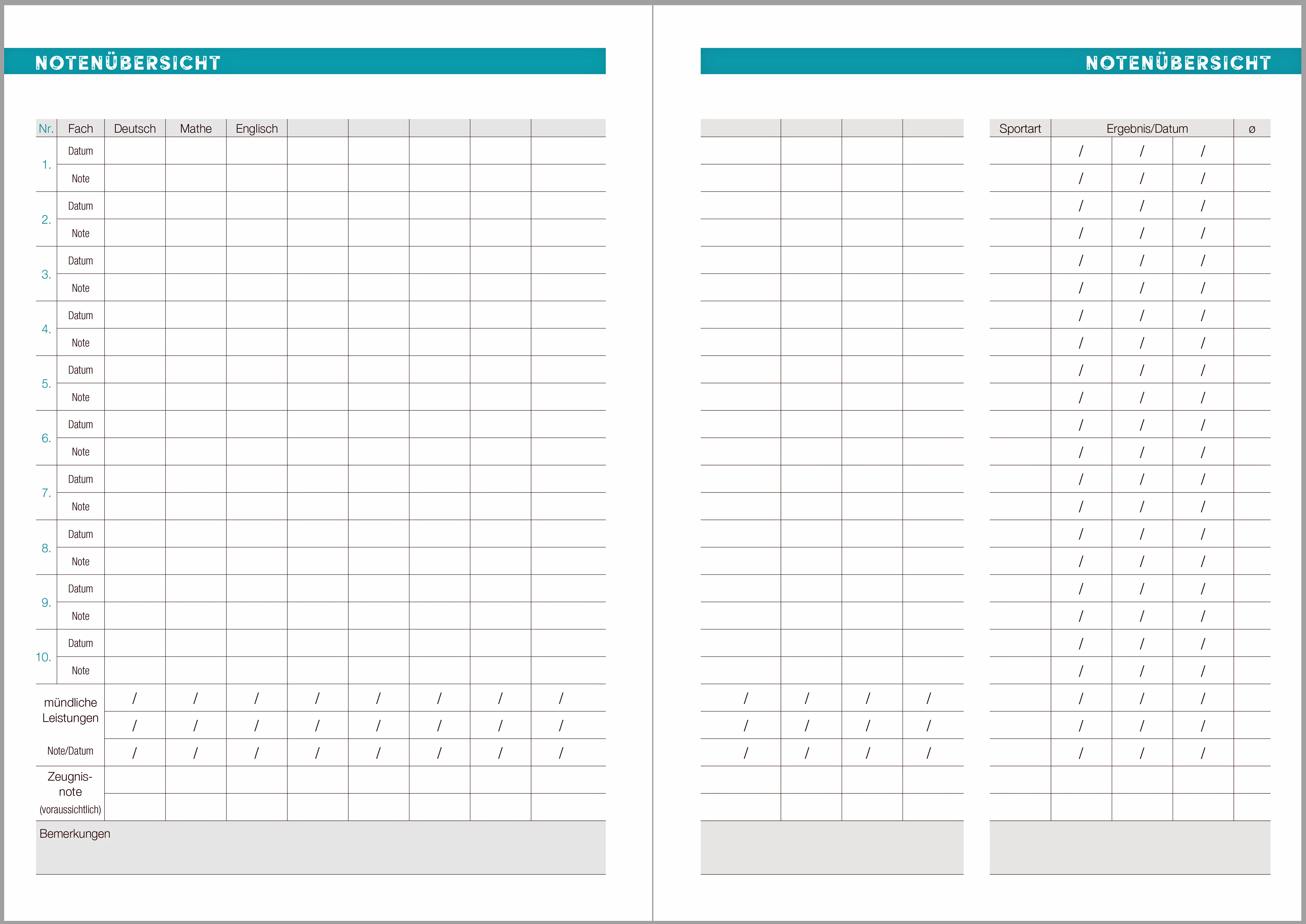 Feiertage, Leistungsübersichten, mit Mitteilungsfeldern für Elternhaus