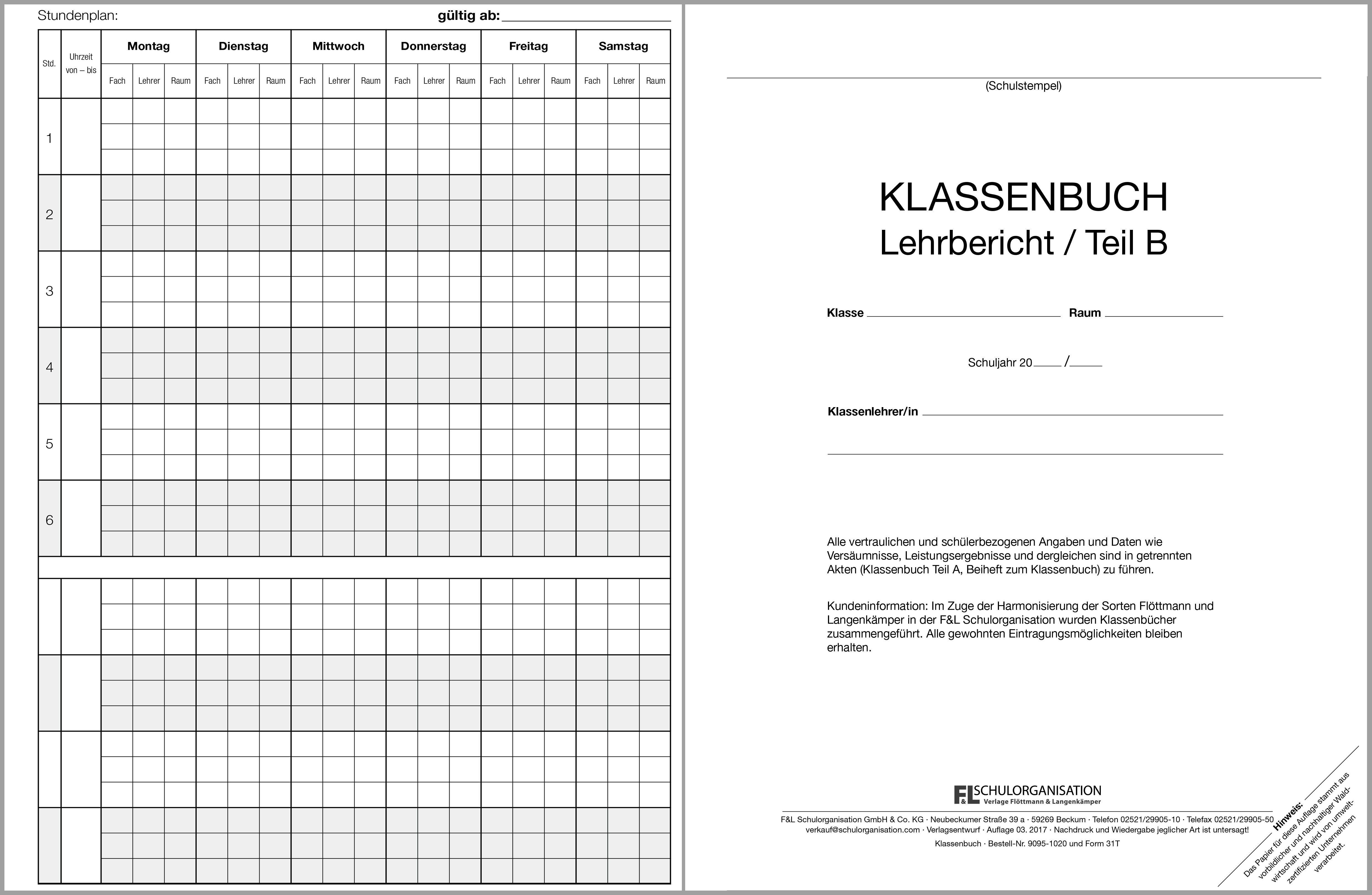 Flöttmann Klassenbuch Teil B (Lehrbericht) mit Schülerverzeichnis in Kurzfassung, Klassenämter und Stundenpläne und den Bericht von Montag bis Freitag. Die vertraulichen Schülerdaten und die Versäumnisse und Verspätungen werden in Teil A geführt.