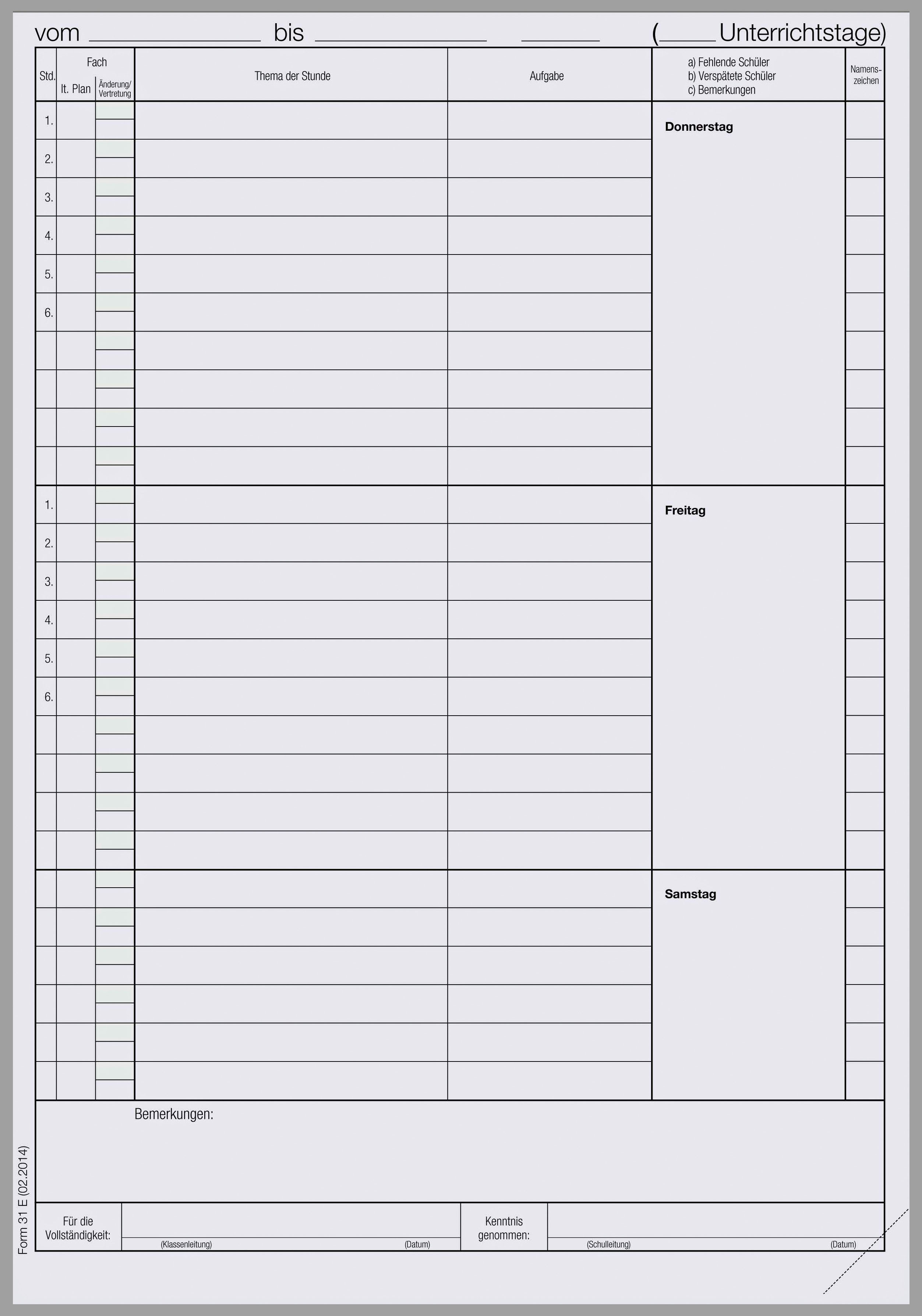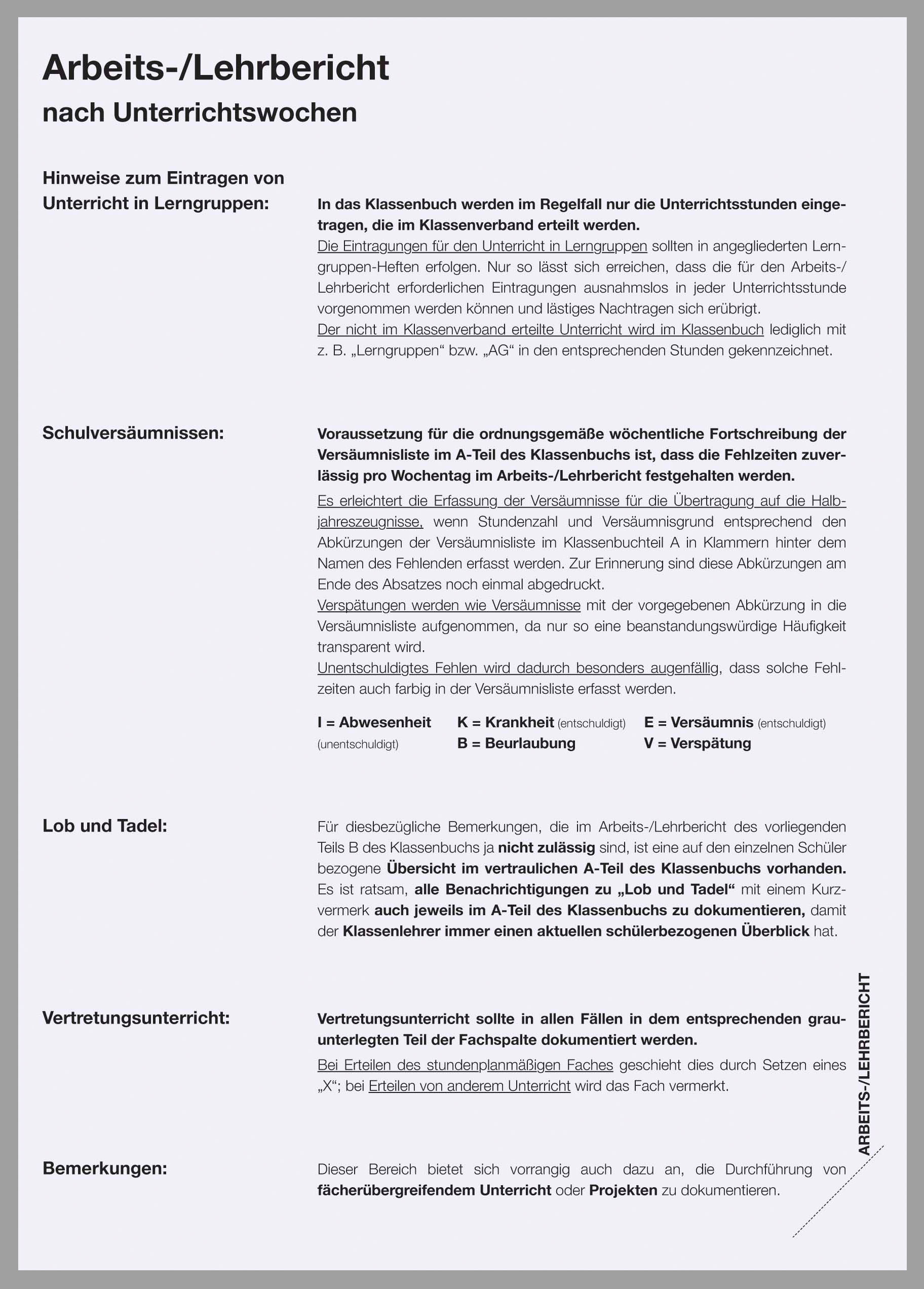 Dieser Teil B für den täglich-stündlichen Bericht ist neutral gehalten, dazu passt der Teil A Schülerdaten je nach Schulform.