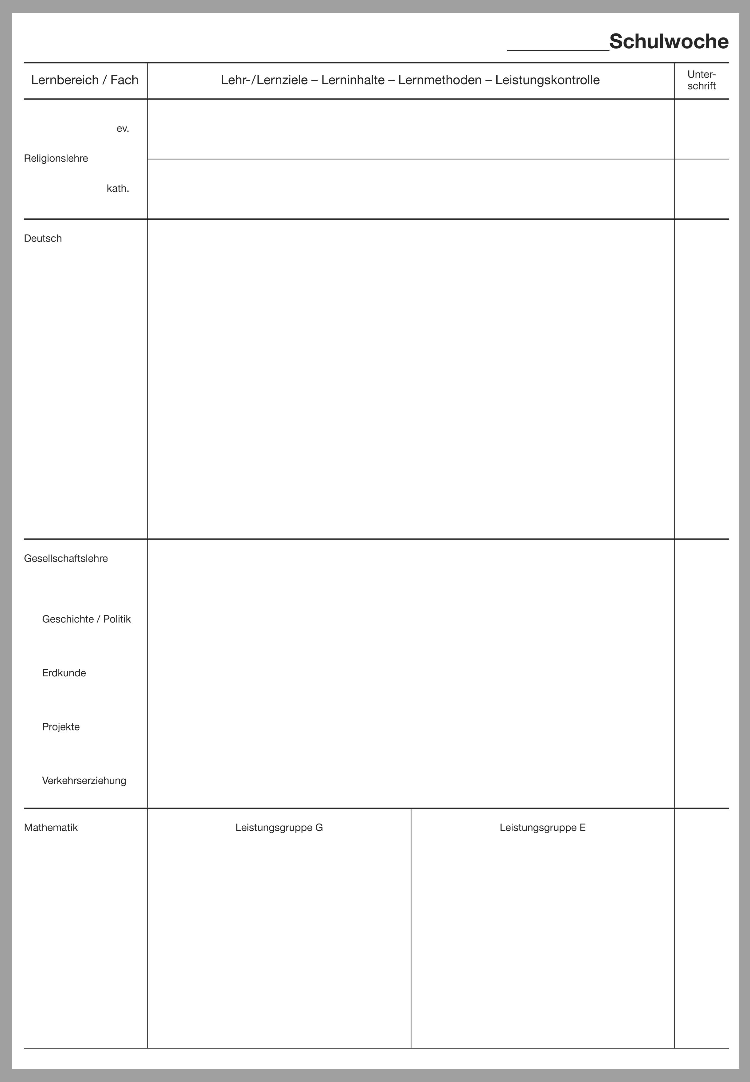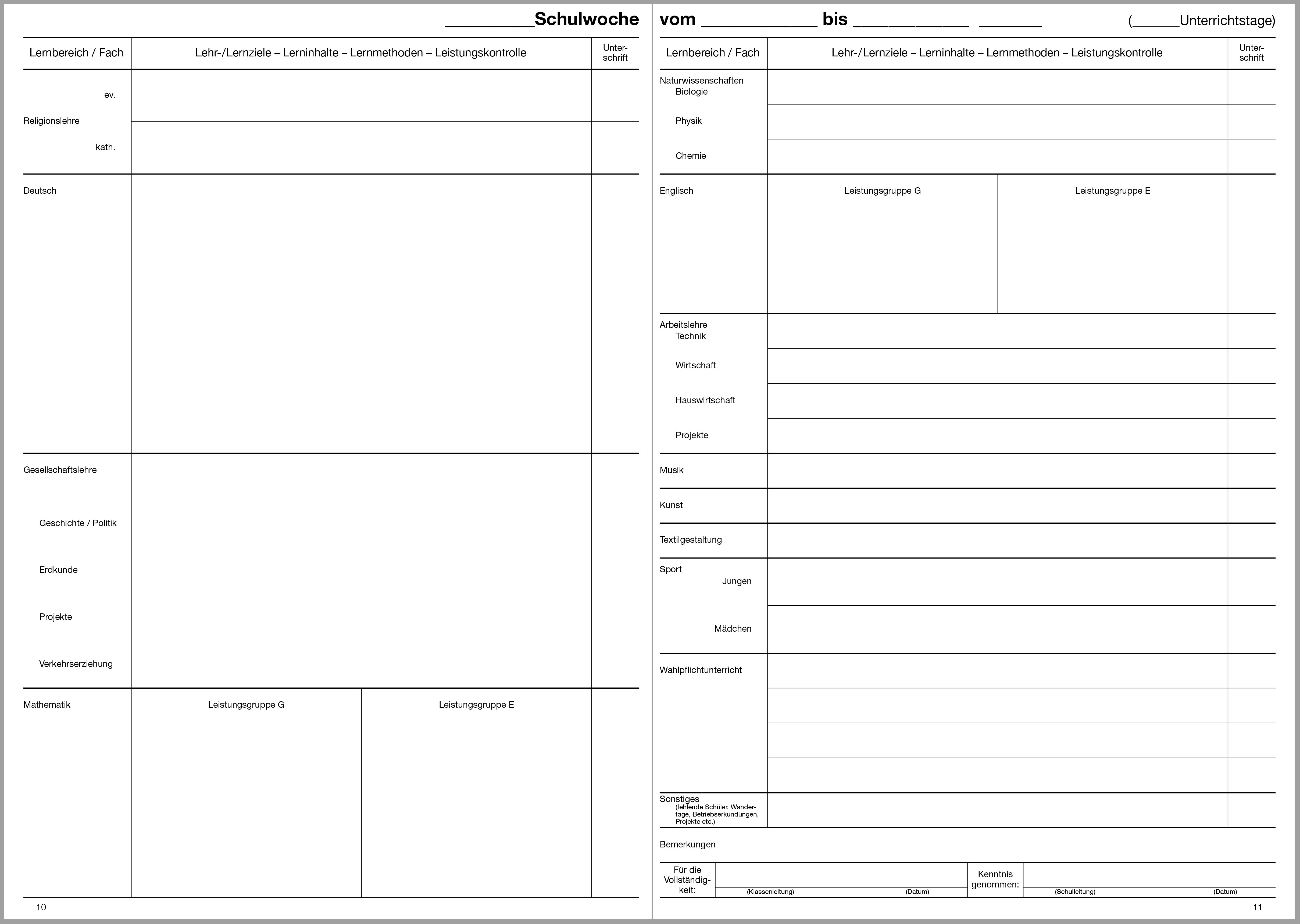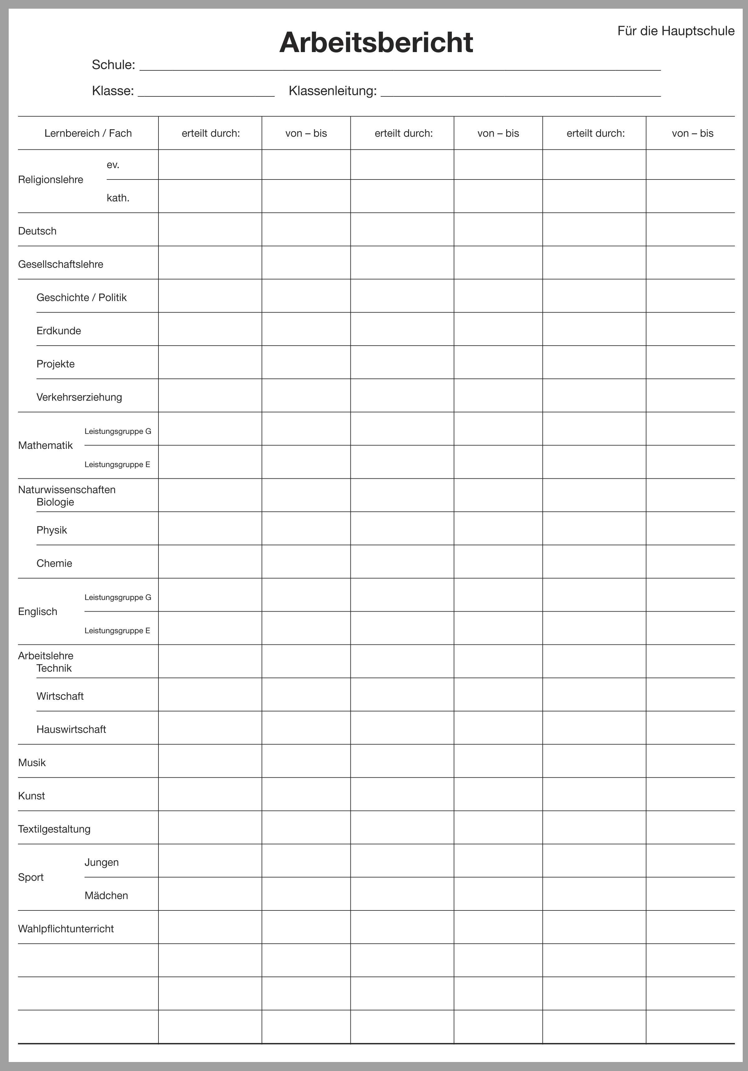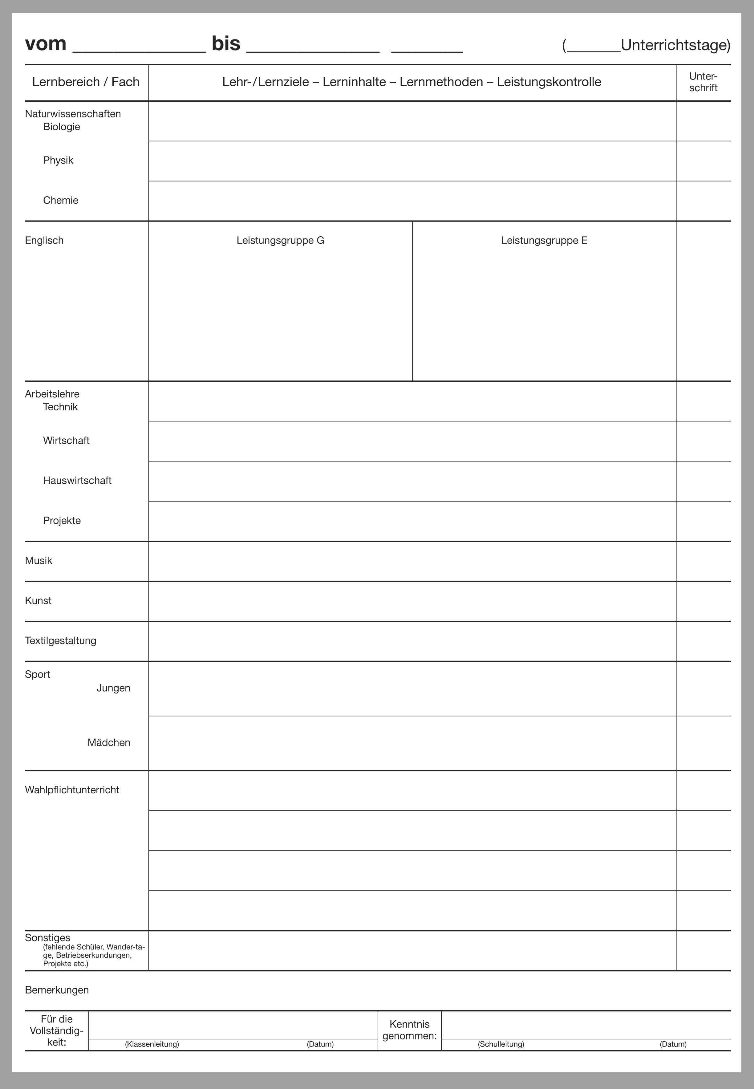 Dieser Teil B für den wochenweisen Bericht ist nach Fächern der Hauptschule NRW gegliedert, dazu passt der Teil A für die Hauptschule Bestell-Nr. 1400XX (XX gleich aktuelle Jahreszahl).