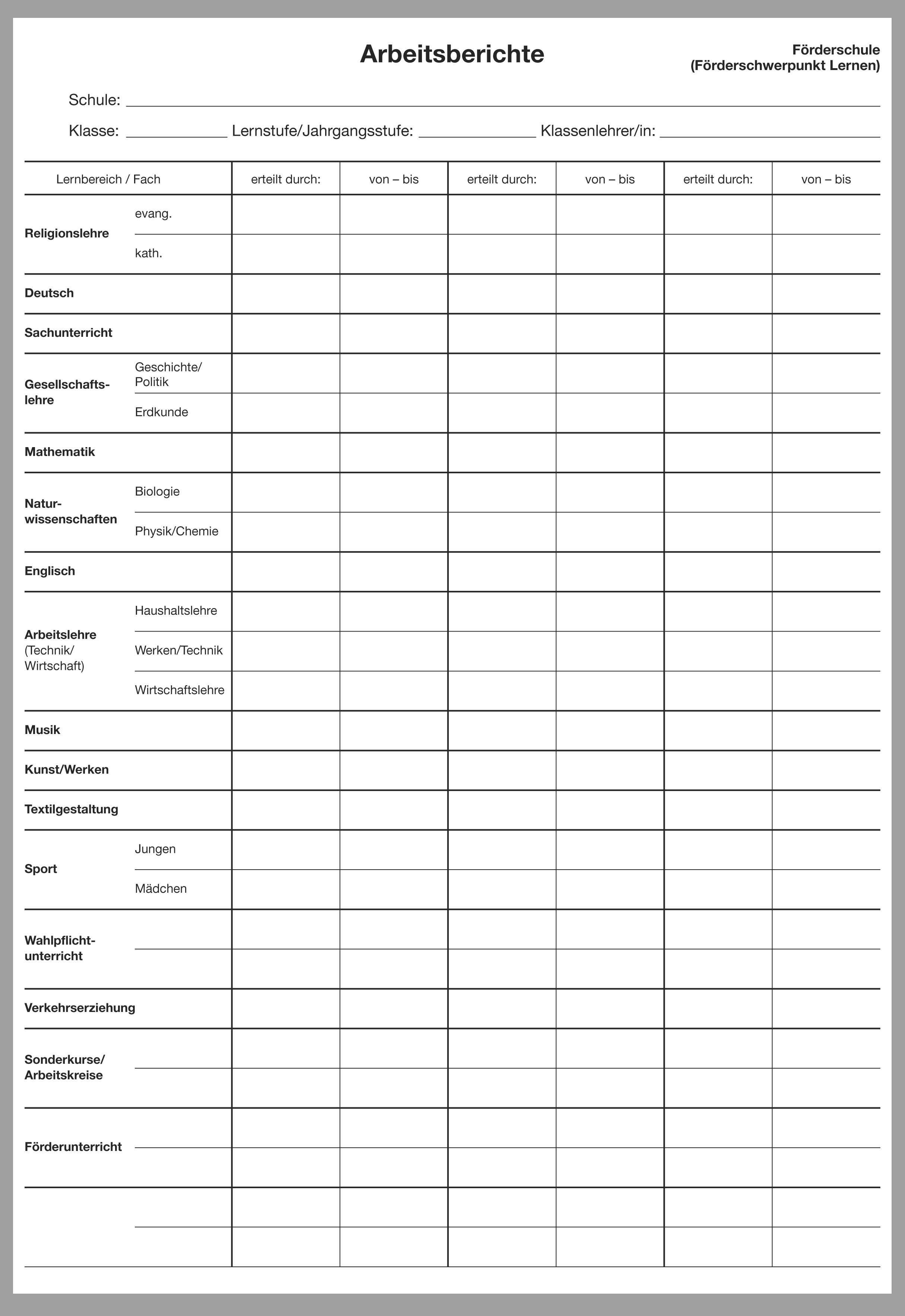 Dieser Teil B für den wochenweisen Bericht ist nach Fächern der Förderschule NRW gegliedert, dazu passt der Teil A Schülerdaten für die Förderschule Bestell-Nr. 1900XX (XX gleich aktuelle Jahreszahl).