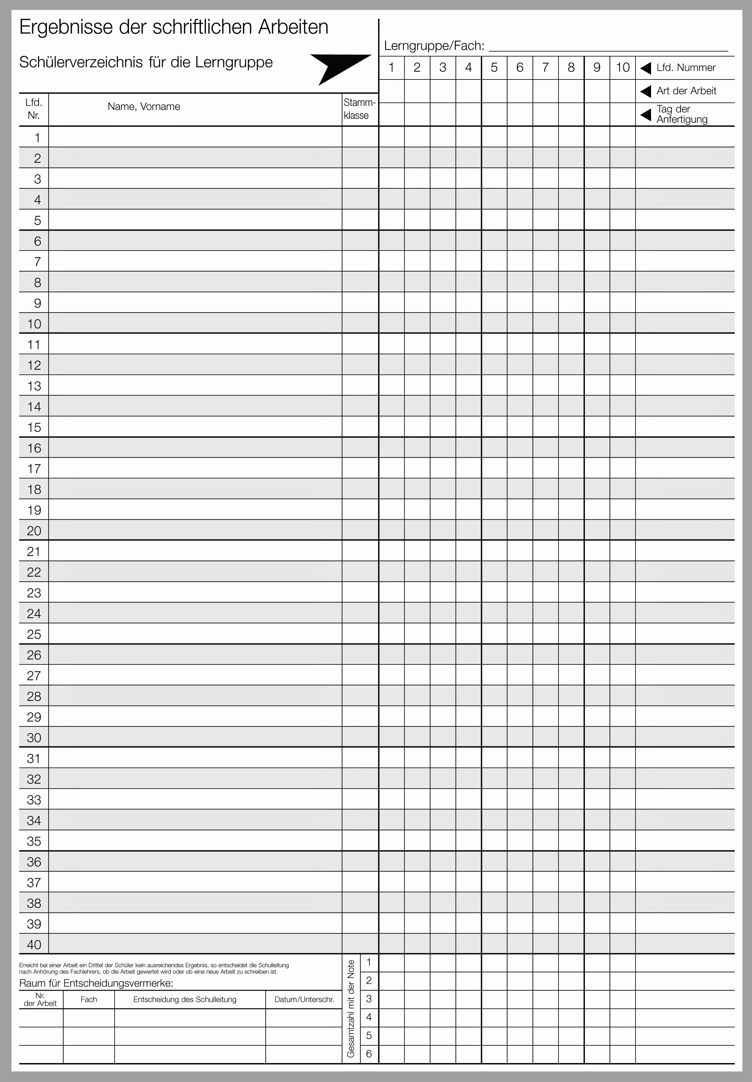 vertraulicher Liste für die Klassenarbeitsergebnisse für ein Schuljahr.