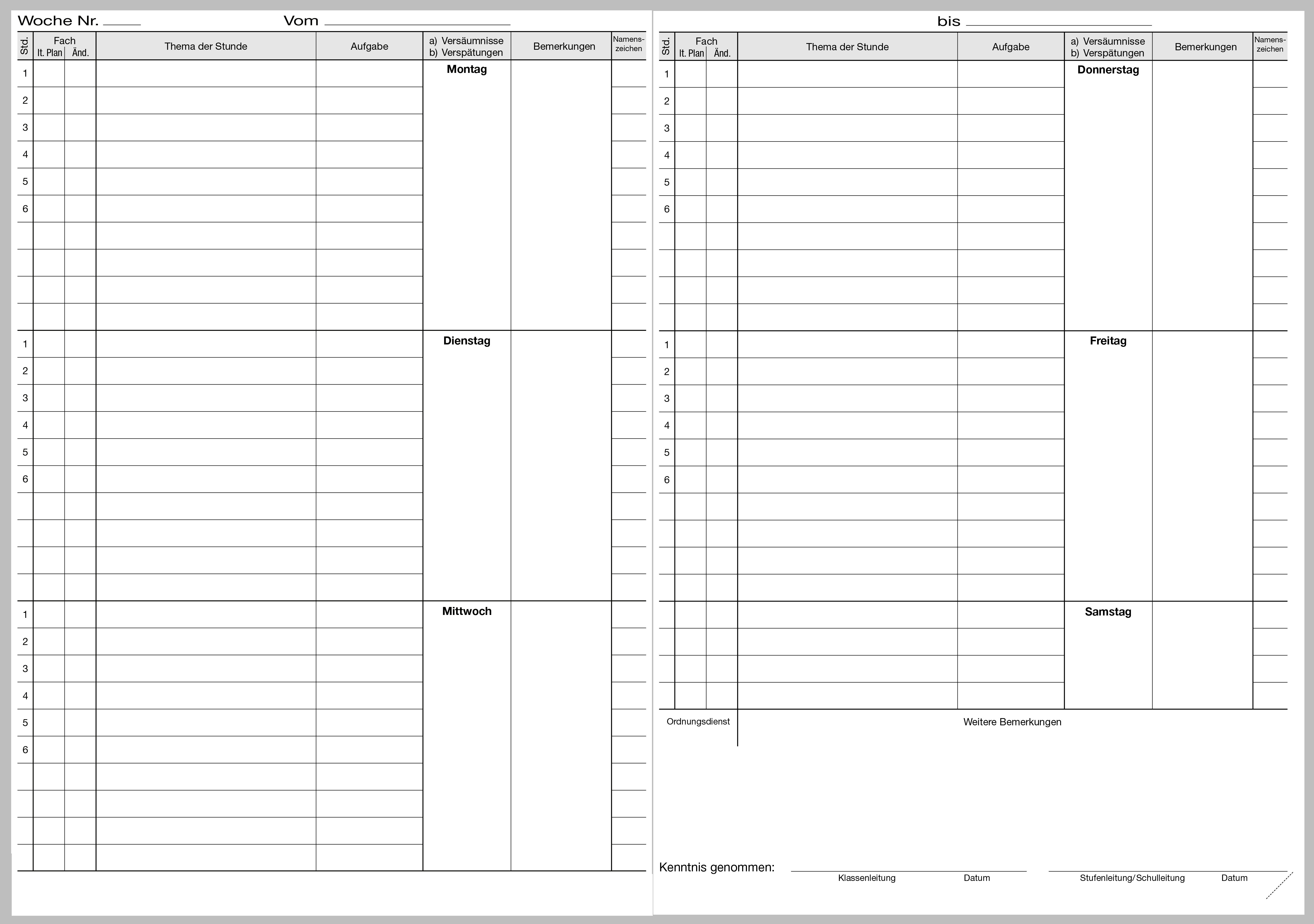 Unterrichtsveranstaltungen, monatlichen Versäumnislisten, variablen Seiten und