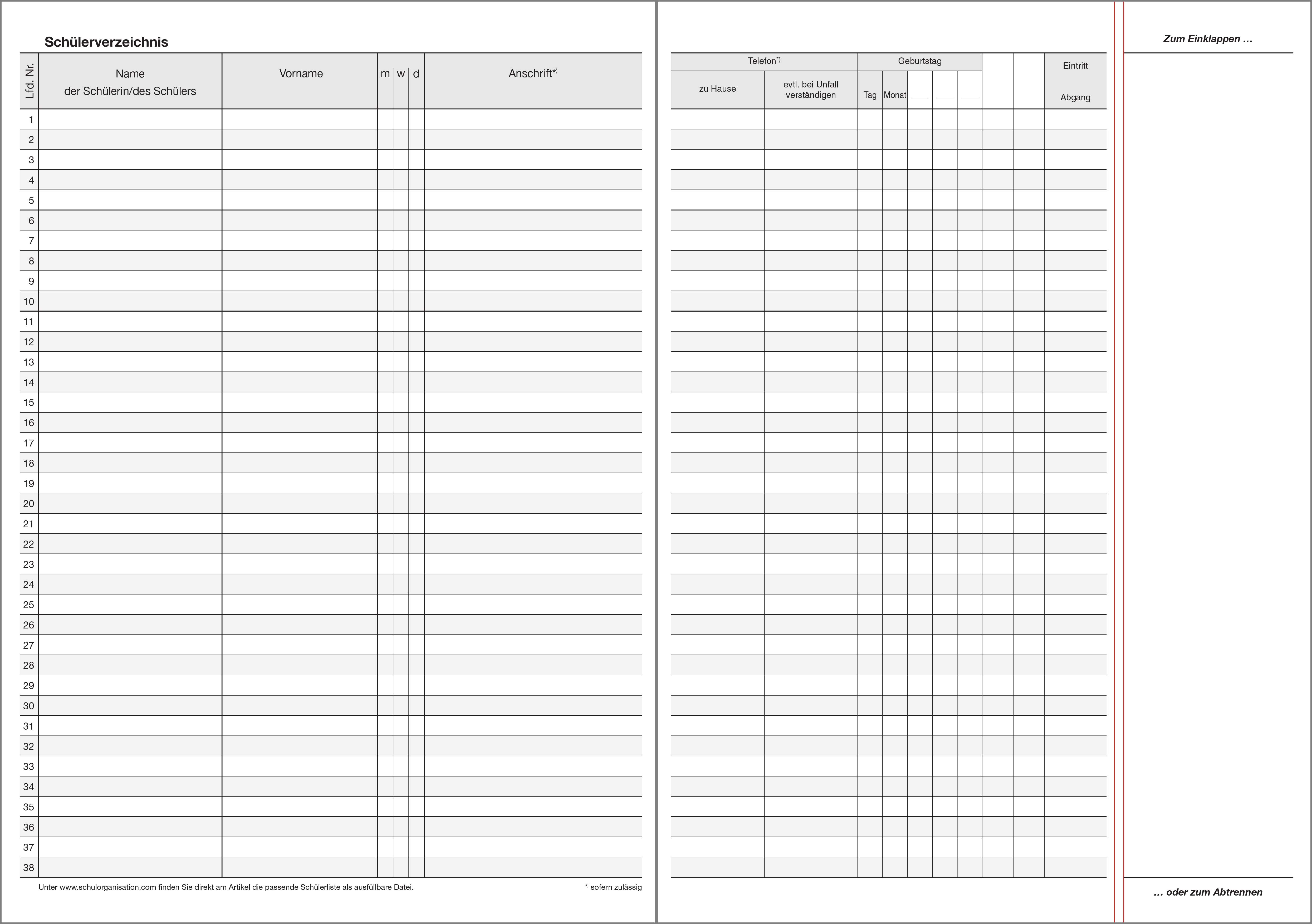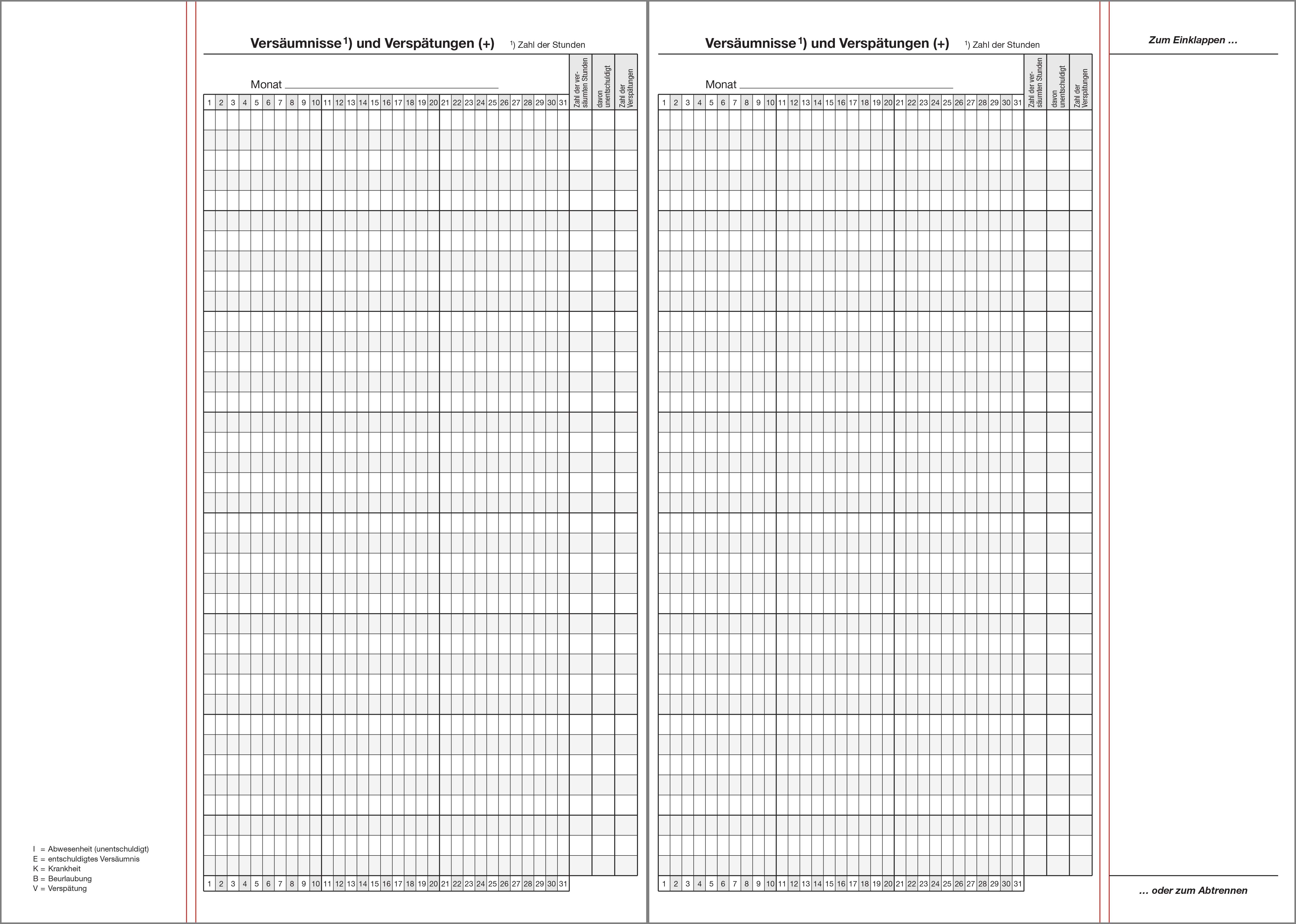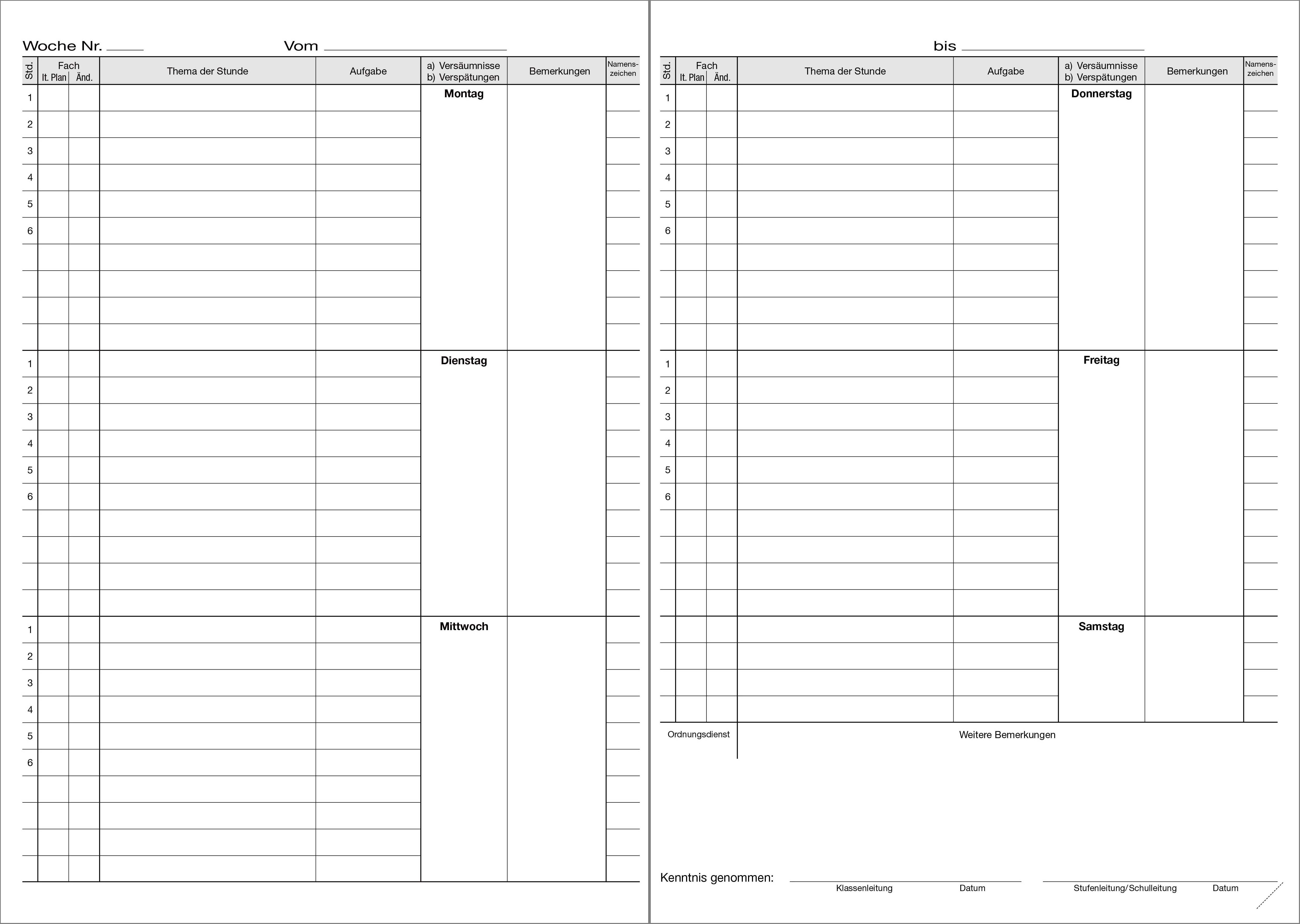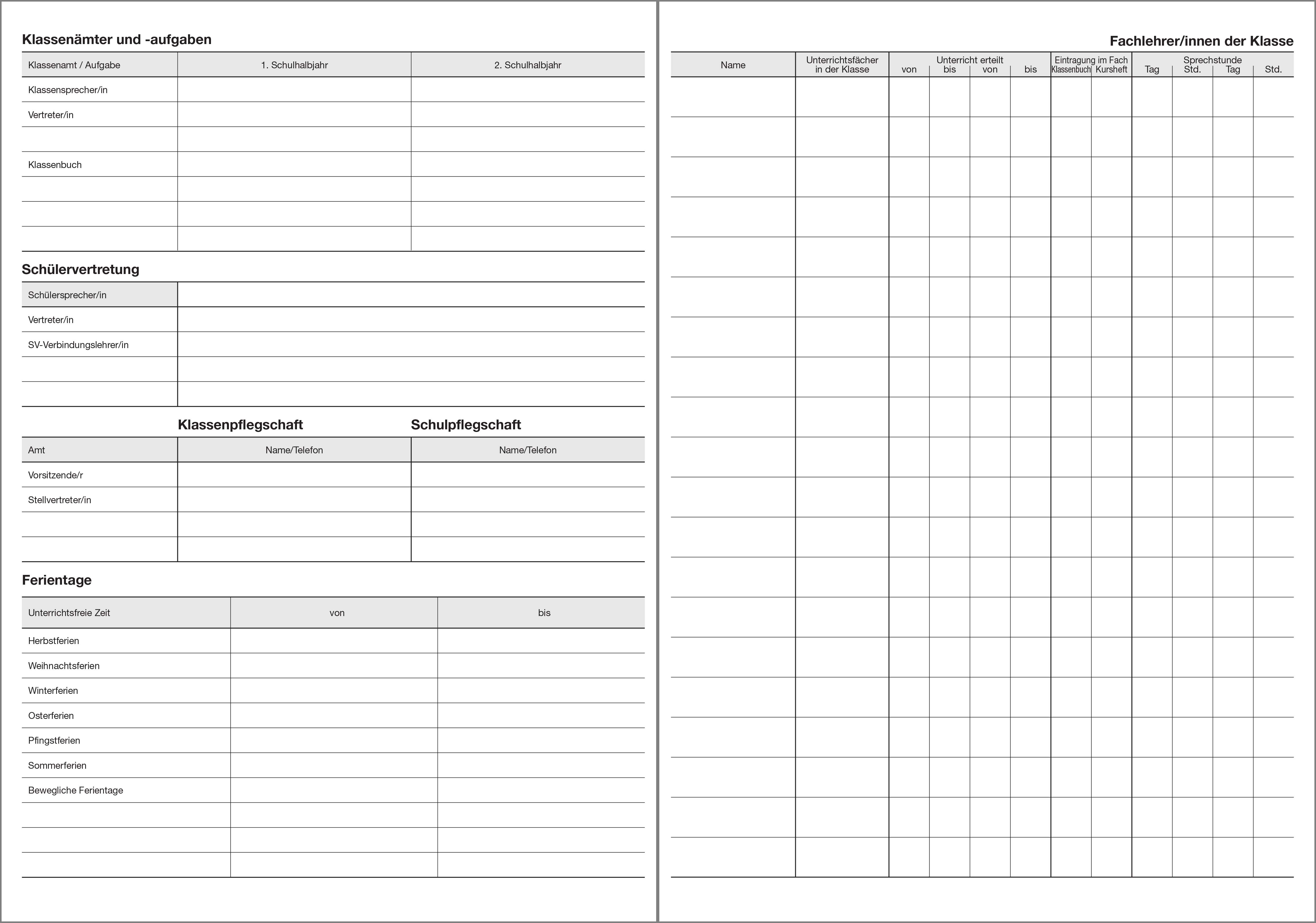 Klassenbuch komplett mit Seiten für Klassenämter, Fachlehrer/innen der Klasse, ausführlichemSchülerverzeichnis, Beteiligungen an Kursen und anderen Unterrichtsveranstaltungen, Ergebnisseder schriftlichen Arbeiten für 16 Fächer, monatlichen Versäumnislisten, variablen Seiten und einiges mehr, Unterrichtsberichte für ein Schuljahr.